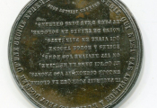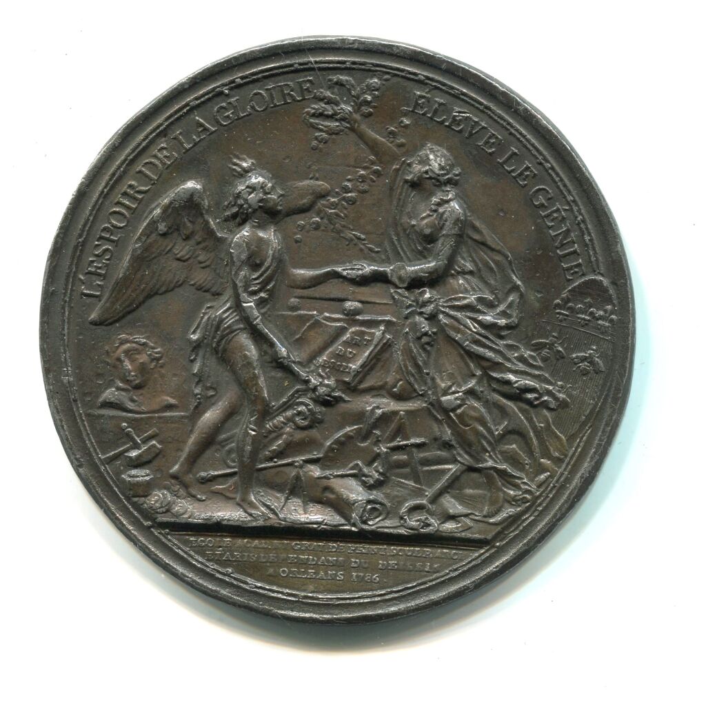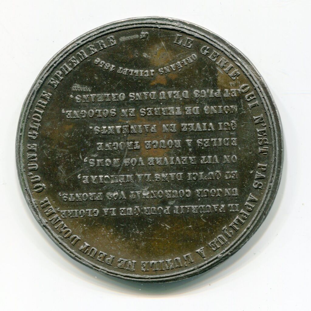 A l'exergue sur 3 lignes : " ECOLE . ACAD . ET . GRAT DE PEINT . SCULP . ARCH / ET ARTS DEPENDANT DU DESSIN / A ORLEANS 1786. - Revers, texte circulaire : " LE GENIE QUI N'EST PAS APPLIQUEA L'UTILE NE PEUT DONNER QU'UNE GLOIRE EPHEMERE " ; en centre texte 9 lignes : "il faudrait pour que la gloire un jours couronne vos fronts, et qu'ici dans la mémoire, on vit revivre vos noms, édiles à rouge trogne, qui vivaient en fainéants. Moins de terre en Sologne et plus d'eau dans ORLEANS / juillet 1858 ".