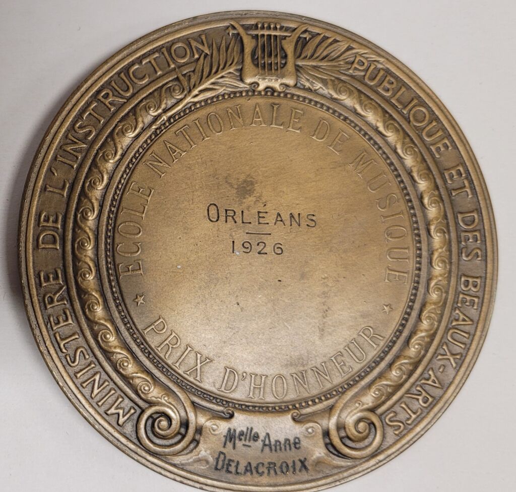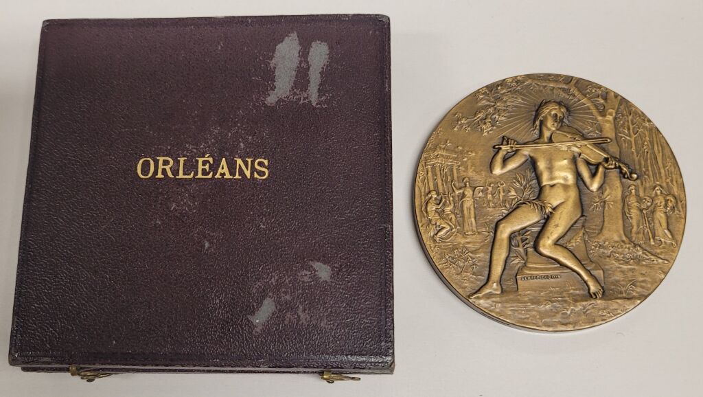 " ECOLE NATIONALE de MUSIQUE - ORLEANS 1926 " - PRIX D'HONNEUR, grande médaille de table 68 mm en bronze - OEuvre du sculpteur Alphée DUBOIS 1er grand prix de Rome 1855 : musicienne laurée en tenue native jouant du violon , au 2e plan scène d'opéra dans un sous-bois - Revers : en légendes circulaires " ministère de l'instruction publique et des beaux-arts / école nationale de musique " - à l'exergue attribution " Mlle Anne DELACROIX " - poinçon corne - en son coffret d'origine, marquage "Orléans " à la forme bois et velours - 151 grammes - L/A n° 2229 a. - TTB