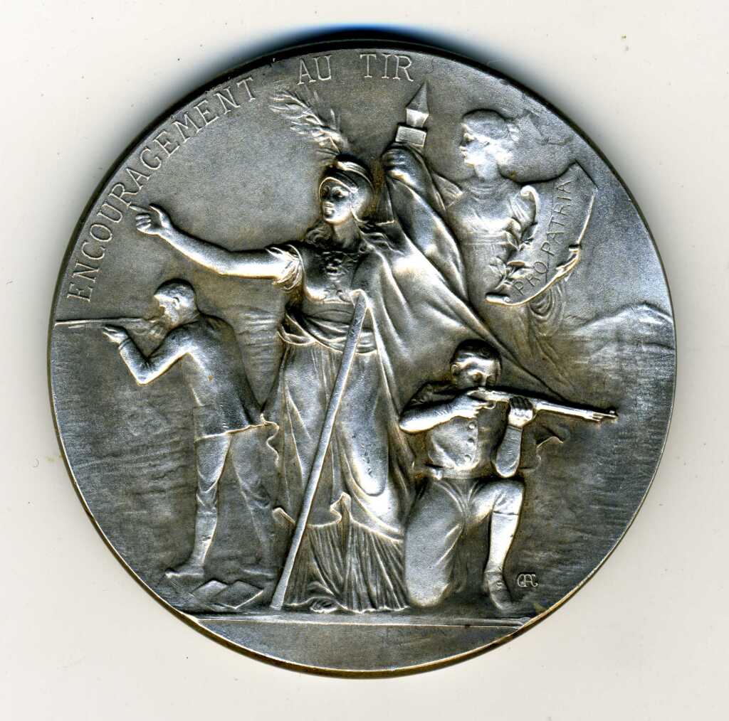 "ENCOURAGEMENT AU TIR - 40e FETE FEDERALE RENNES 1er juin 1914" - UNION des SOCIETES de GYMNASTIQUE de France " - grande médaille classe argent en bronze argenté, la France en toge, coiffée du bonnet phrygien, tenant drapeau, bras droit tendu. Derrière elle une autre femme tient un parchemin légendé Patria et tend de la main droite une branche de laurier. A sa droite tireur agenouillé, à sa gauche tireur debout, œuvre signée G H - Revers : Titres intérieur/extérieur d'une couronne de palmes de laurier et chêne.