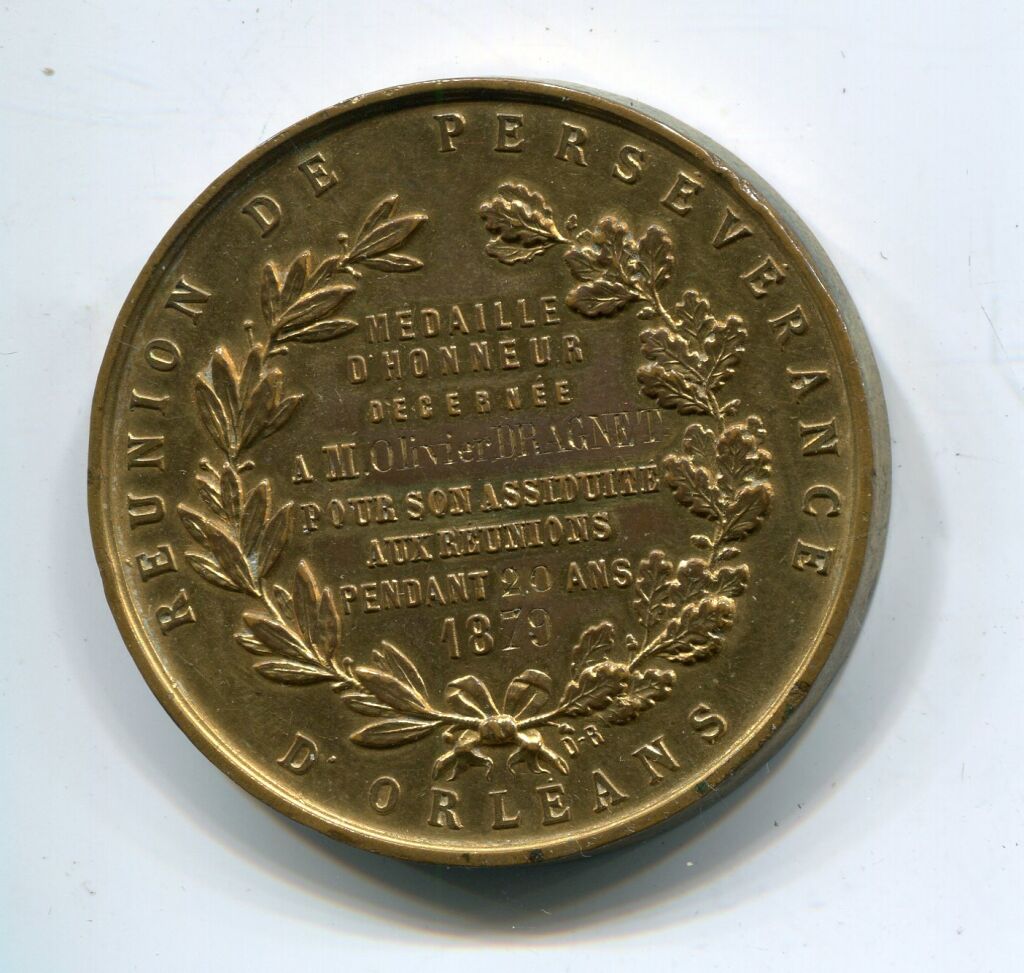 Revers : " REUNION de PERSEVERANCE D'ORLEANS, médaille d'honneur décernée à Mr Olivier DRAGNET pour son assiduité aux réunions pendant vingt ans 1879 -