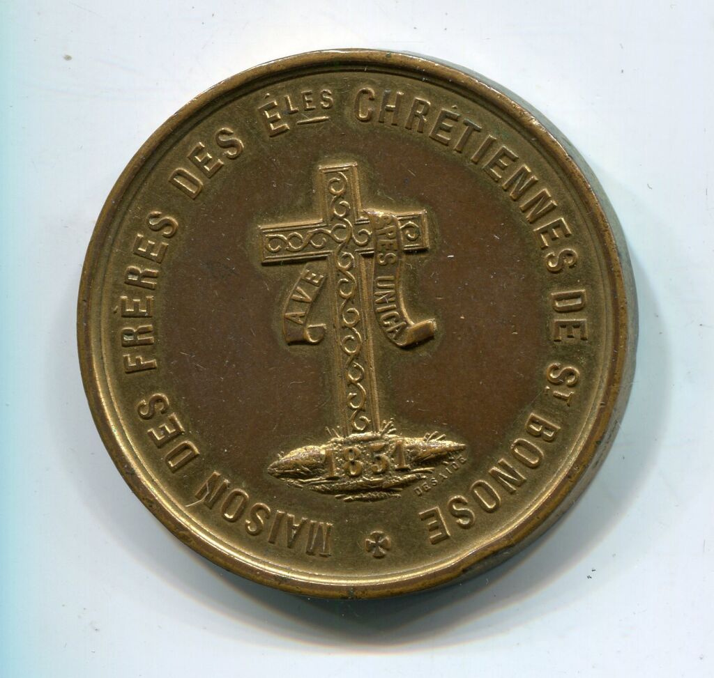Enseignement privé - "MAISON des FRERES des ECOLES CHRETIENNES de St BONOSE " - médaille d'honneur classe OR, croix ornementé sur un socle daté 1851, banderole sur la croix légendée AVE SPES UNIQUE - signé Desaïde.