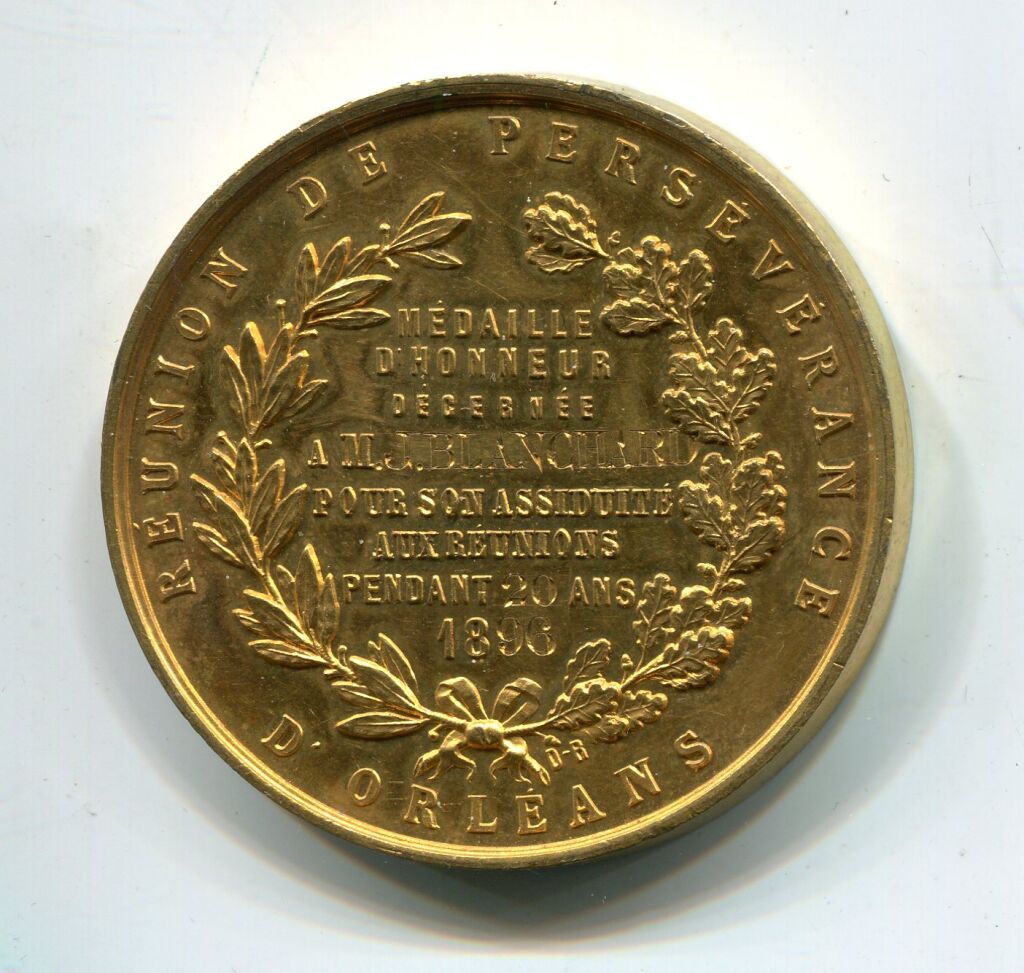Revers : " REUNION de PERSEVERANCE D'ORLEANS, médaille d'honneur décernée à Mr M.J BLANCHARD pour son assiduité aux réunions pendant vingt ans 1896 -