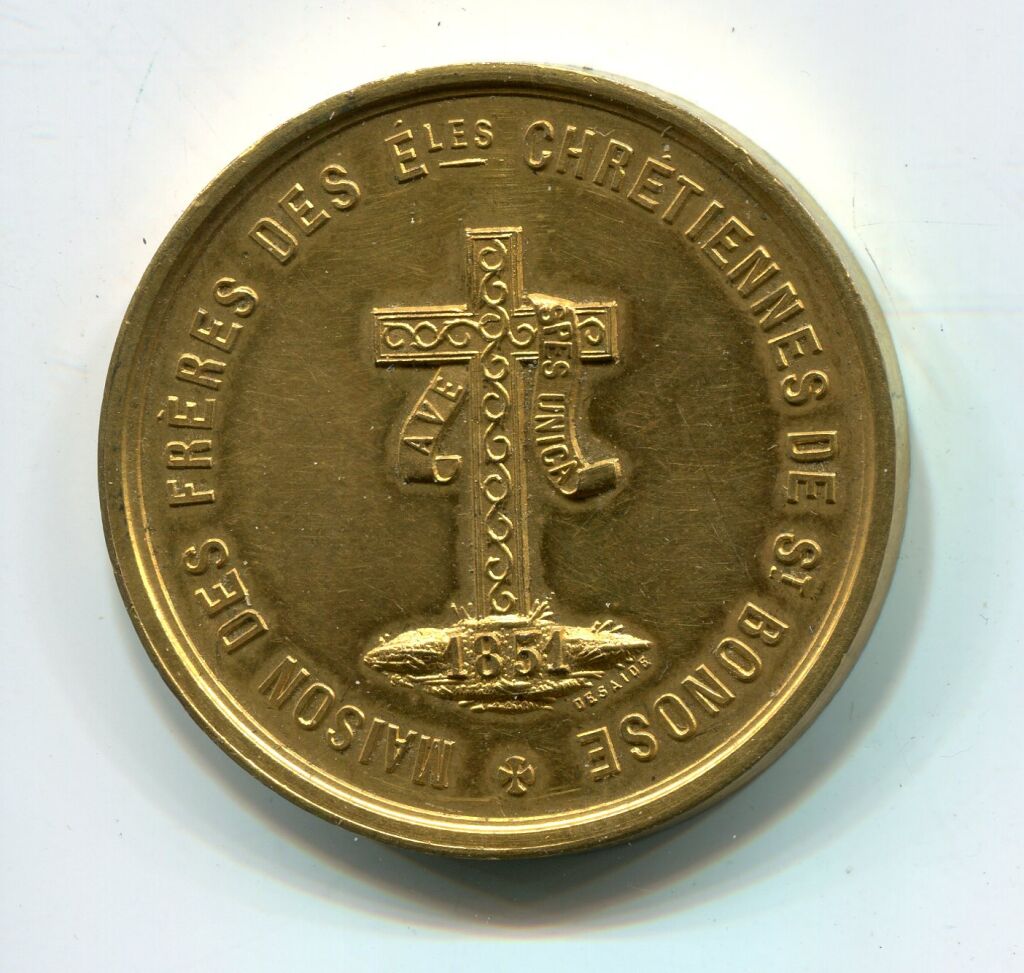 Enseignement privé - "MAISON des FRERES des ECOLES CHRETIENNES de St BONOSE " - médaille d'honneur classe OR, croix ornementé sur un socle daté 1851, banderole sur la croix légendée AVE SPES UNIQUE - signé Desaïde.
