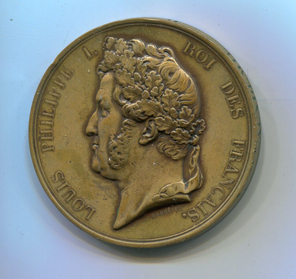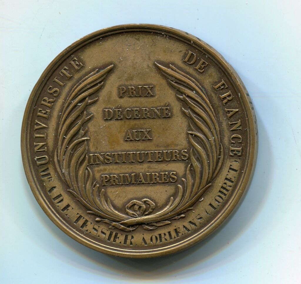 Enseignement public - " LOUIS PHILIPPE I ROI des FRANCAIS ", buste haut relief par BARRE - Revers : " UNIVERSITE de FRANCE, PRIX DECERNE aux INSTITUTEURS PRIMAIRES ", entre 2 grandes palmes ; attribution à l'exergue : " Mr A.D.E. TESSIER à ORLEANS - LOIRET " - Sur la tranche mention gravée " ACADEMIE D'ORLEANS 1835".