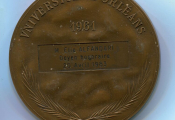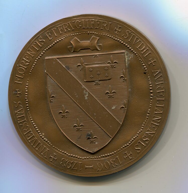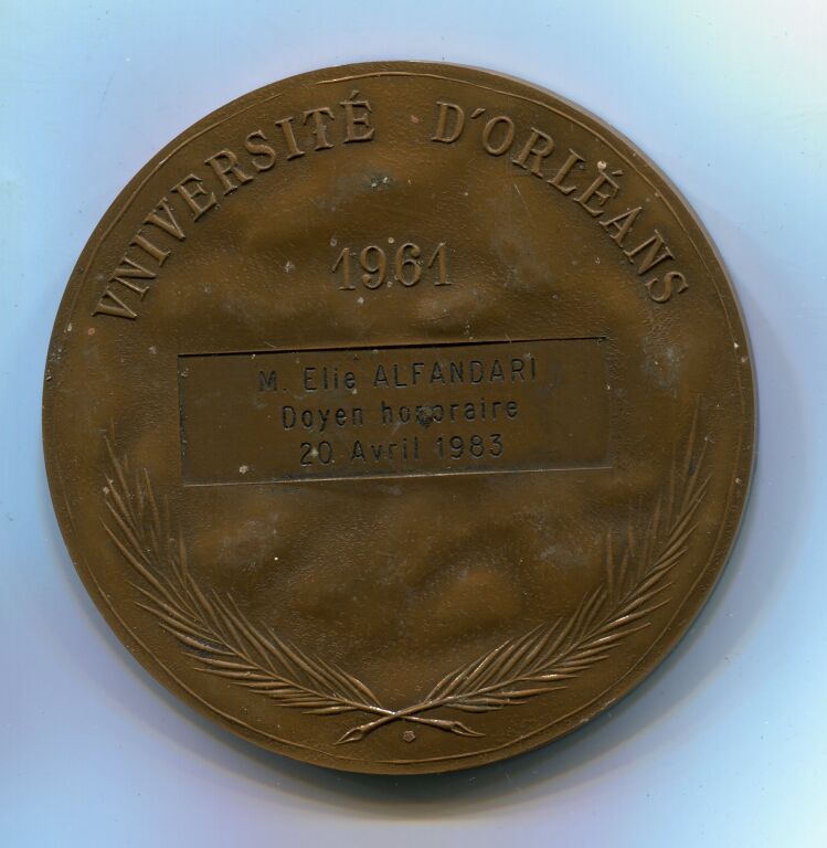 "VNIVERSITAS + FLORENTIS ET FRVCIIFERI + STVDII + AVRELIANENSIS + 1306 - 1796" en légende circulaire, en centre blason à fleurs de lis de l'Université - Revers : au-dessus de 2 palme attribution à M. Elie ALFANDARI Doyen honoraire 20 avril 1983 ". - TTB