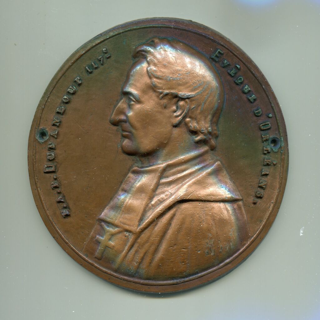 " F.A.P. DUPANLOUP 117° EVEQUE D'ORLEANS ", en légende circulaire. Son buste très haut relief, profil à gauche - Médaille coulée monoface pour fixation - Plomb cuivré, grand module de 120 mm - 627 (six cent vingt sept grammes ! ).