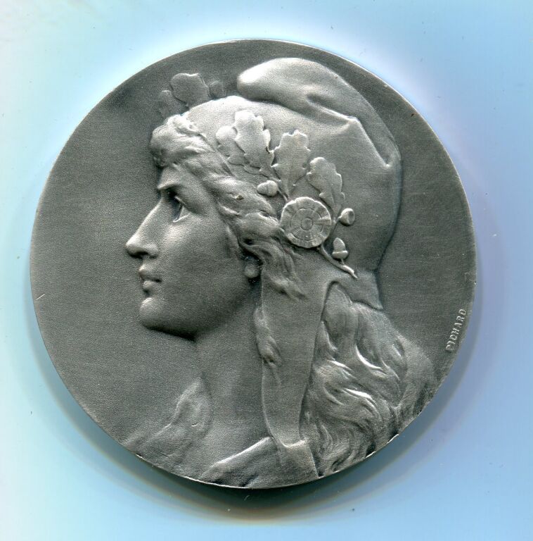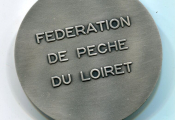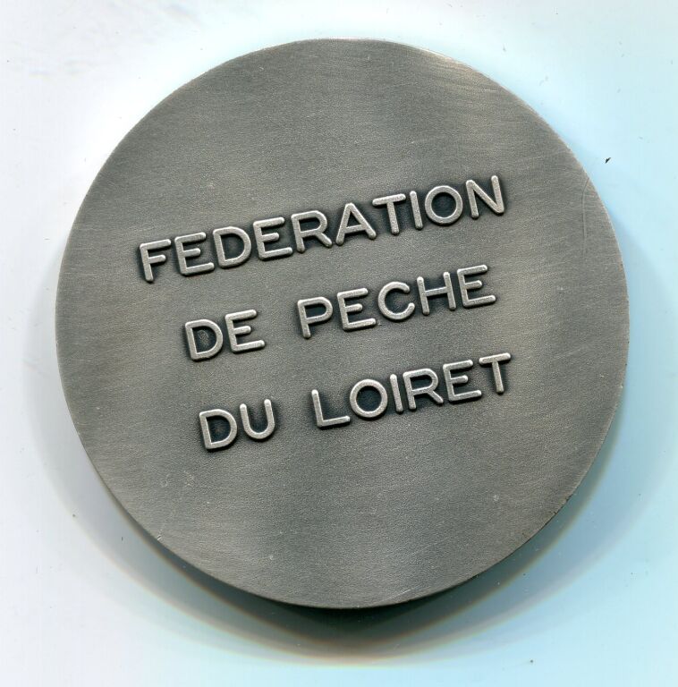 " FEDERATION de PECHE du LOIRET " - médaille classe argent - Tête de Marianne, profil à gauche, coiffée du bonnet phrygien avec palme de feuilles de chêne - Frappe Pichard à Saumur - Bronze argenté, 50 mm, 62,97 grammes - Poinçons sur tranche - TTB