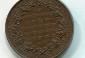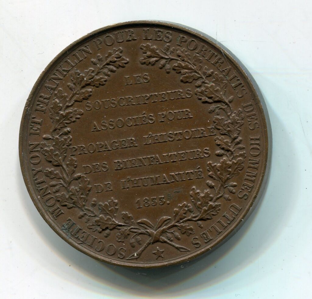 Revers, en légende circulaire "Société Monthyon et Franklin pour les portraits des hommes utiles ; en centre à l'intérieur de 2 palmes de feuilles de chêne, texte 9 lignes : " Les souscripteurs associés pour propager l'histoire des bienfaiteurs de l'humanité, 1833 ".
