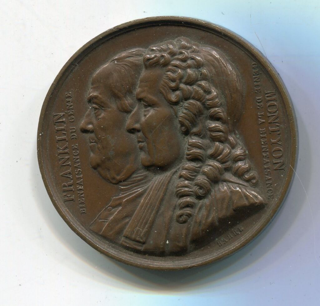 " FRANKLIN BIENFAISANCE du GENIE et MONTYON GENIE de la BIENFAISANCE ", leurs bustes, œuvre du médailleur Barre, frappe haut relief, accolés - ( * ) ( ** ) -