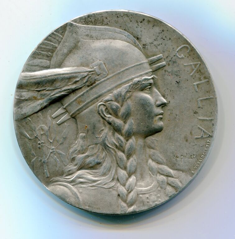 ( * ) Gallia : la défaite de 1870 avait marqué l'esprit des français et provoqué le développement des activités patriotiques et l'essor des sociétés sportives et de tir afin de préparer la jeunesse à de nouveaux combats pour récupérer l'Alsace et la Lorraine annexées par l'Allemagne. C'est ainsi que naissent les médailles GALLIA, guerrière Gauloise représentant La Patrie et véhiculer l'image d'une France prête au combat.