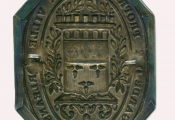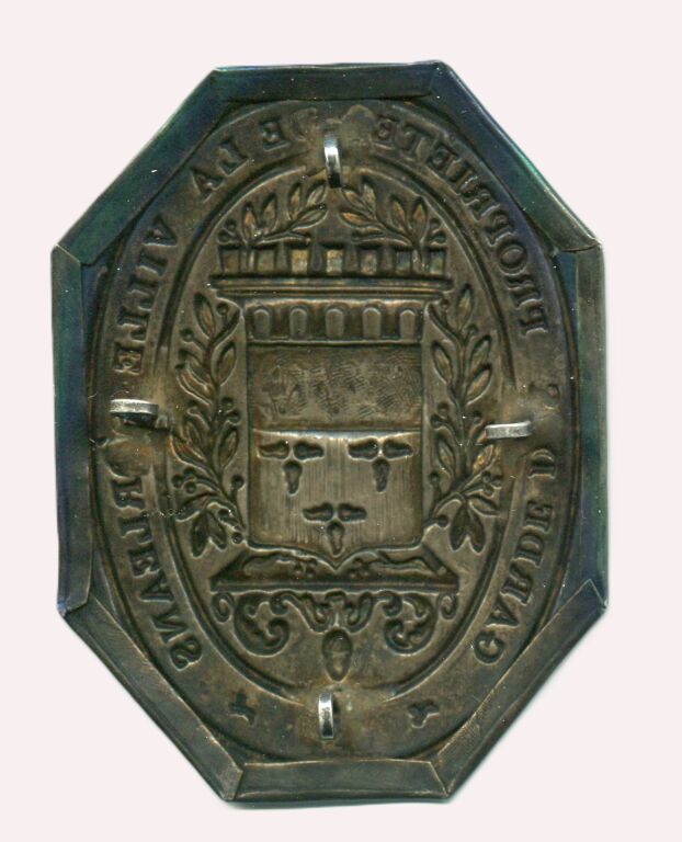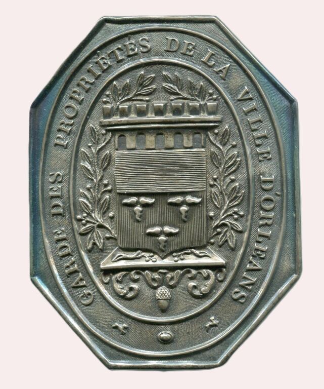 " GARDE des PROPRIETES de la VILLE D'ORLEANS " - belle et grande PLAQUE de FONCTION en métal argenté repoussé 103 x 80 mm. Octogonale, titre en pourtour dans une banderole, 2 chiens courants au-dessous. En centre blason de ville surmonté de remparts entre 2 palmes de feuilles de laurier, l'ensemble sur une console à décor de gland. Attache revers par 4 anneaux - ETAT SUPERBE, RARISSIME et SUREMENT UNIQUE.