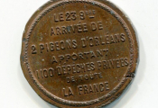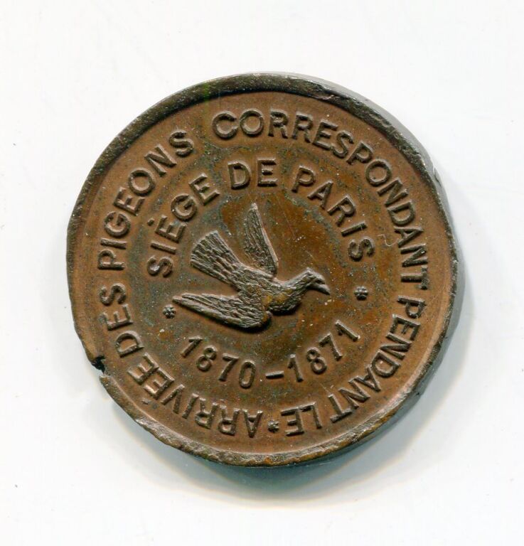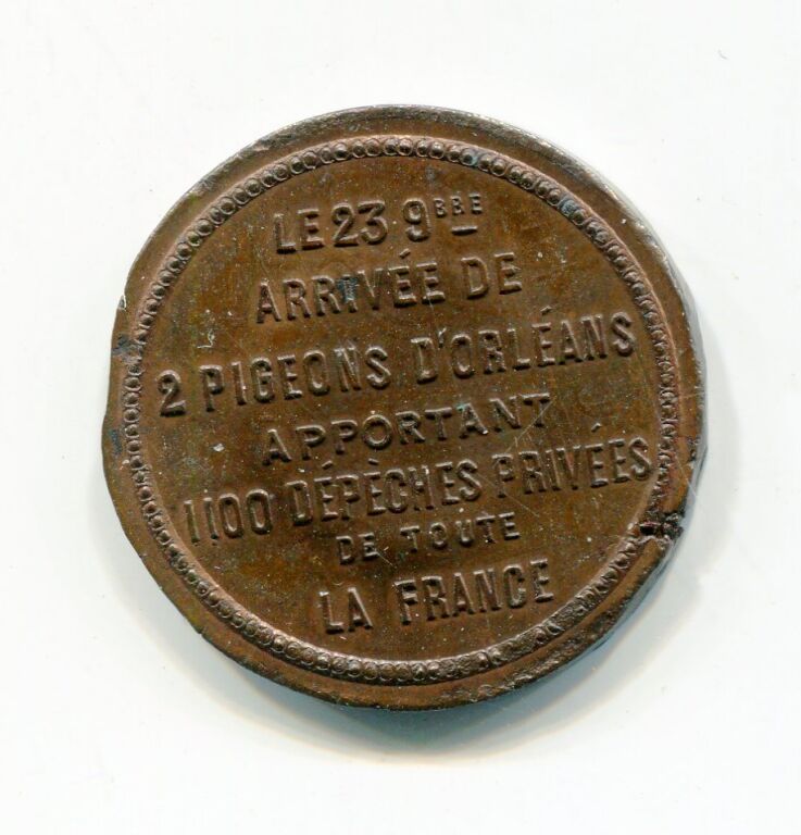En centre PIGEON VOYAGEUR volant à droite - En légendes circulaires " Arrivée des pigeons correspondant pendant le Siège de Paris 1870-1871 " - Revers : "le 23 9bre (novembre) ARRIVEE de DEUX PIGEONS D'ORLEANS apportant 1 100 dépêches privées de toute la France " - ( qq chocs sur le listel ).