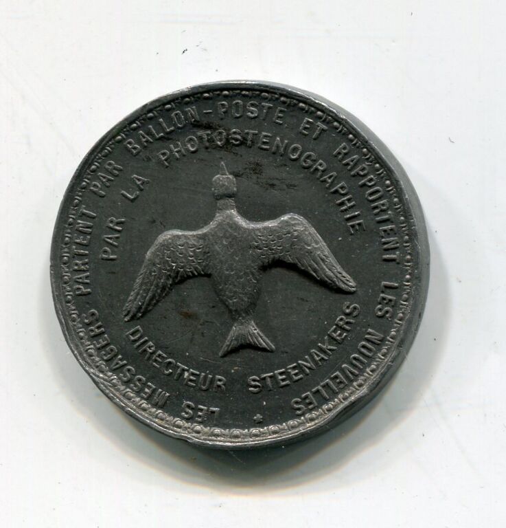 En centre BALLON POSTE " LA GIRONDE le 8 9bre (novembre) 1870 " - en légende circulaire : "Parti de la gare d'Orléans, conduit par le marin Gallet " - au revers : Pigeon voyageur en centre ; double légendes circulaires : " Les messagers partent par ballon poste et rapportent les nouvelles / par la photosténographie. Directeur Steenakers ".