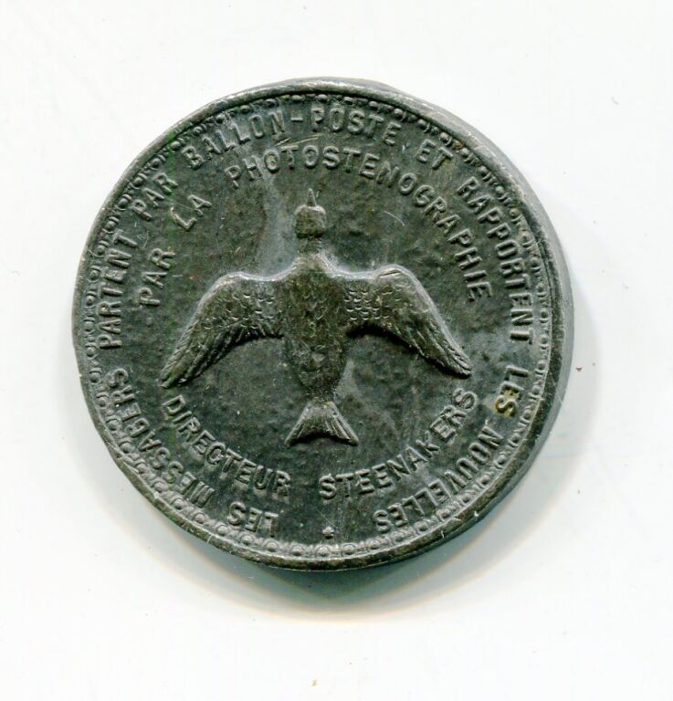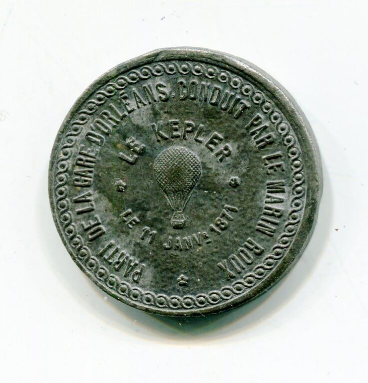 En centre BALLON POSTE " LE KEPLER le 11 janvier 1871 " - en légende circulaire : "Parti de la gare d'Orléans, conduit par le marin Roux " - au revers : Pigeon voyageur en centre ; double légendes circulaires : " Les messagers partent par ballon poste et rapportent les nouvelles / par la photosténographie. Directeur Steenakers ".