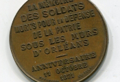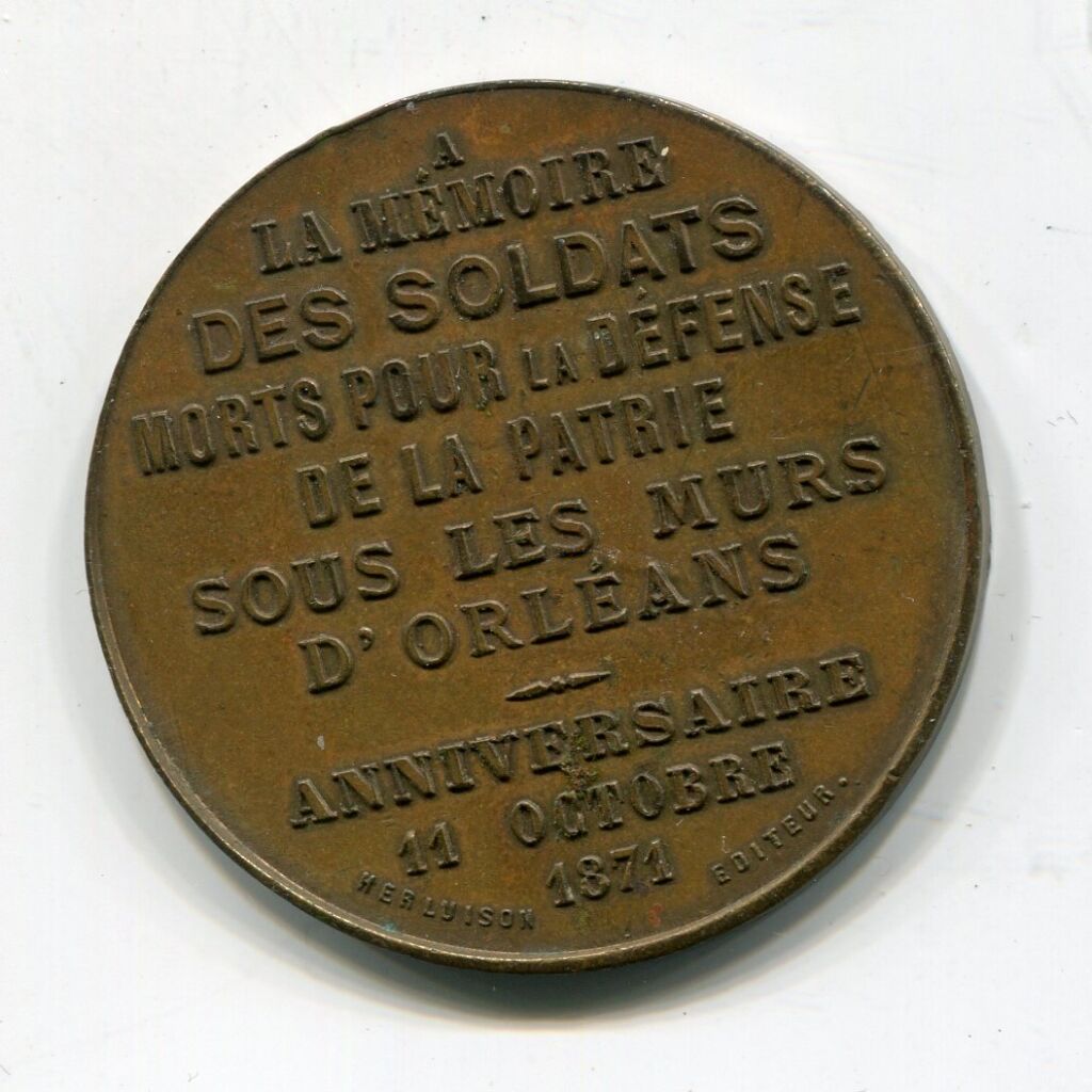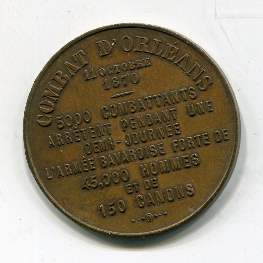 Avers : COMBAT D'ORLEANS 11 octobre 1870 " 5000 combattants arrêtent pendant une demi-journée l'armée bavaroise forte de 45,000 hommes et de 150 canons ".