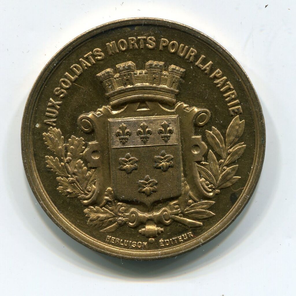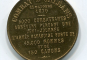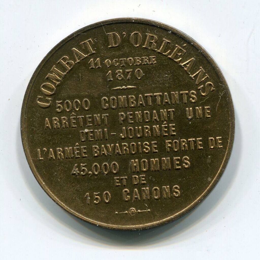 Armoiries de la ville d'Orléans dans un écu barique accosté de 2 rameaux chêne et olivier., à l'exergue signature " Herluison éditeur ". - au revers, texte en dix lignes : " Combat d'Orléans 11 octobre 1870 / 5000 combattants arrêtent pendant une demi-journée l'armée bavaroise forte de 45 000 hommes et de 150 canons ". - bronze doré.