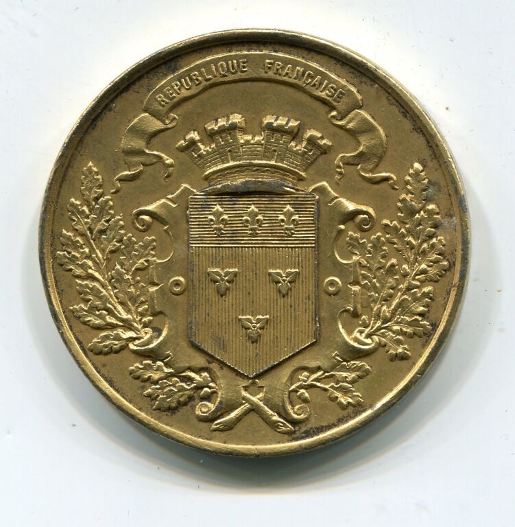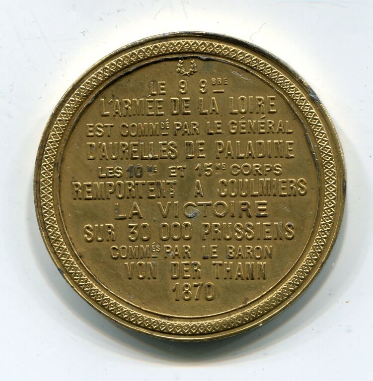 GUERRE 1870 - COMBATS D'ORLEANS - Médaille commémorative "République Française". Blason d'Orléans couronné posé sur un écu baroque accosté de 2 palmes de feuilles de chêne - au revers texte 11 lignes sous une couronne civique : " LE 9 9bre (novembre) L'ARMEE de la LOIRE EST COMMdé par le GENERAL D'AURELLES de PALADINE. Les 10 me ET 15 me corps remportent à COULMIERS la VICTOIRE sur 30 000 prussiens Commandés par le Baron Von Der Thann 1872 " - Frise décorative en pourtour. Étain doré 46 mm - 43,82 grammes - L/A n° 842 - TTB
