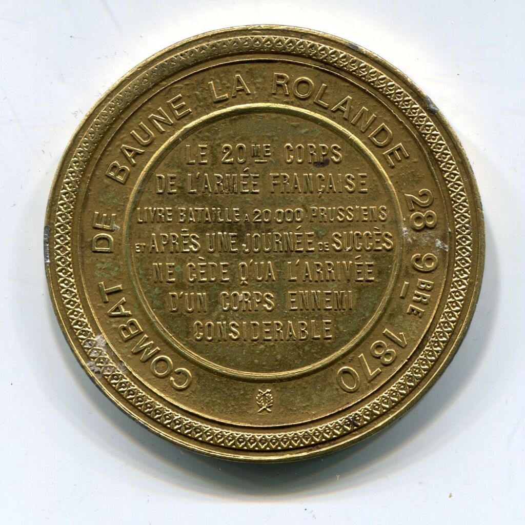 GUERRE 1870 - COMBATS D'ORLEANS - Médaille commémorative "République Française". Blason d'Orléans couronné posé sur un écu baroque accosté de 2 palmes de feuilles de chêne - au revers texte 7 lignes : " COMBAT DE BEAUNE LA ROLANDE 28 9bre (novembre) 1870 - le 20e corps de l'armée française livre bataille à 20 000 prussiens et après une journée de succès ne cède qu'a l'arrivée d'un corps ennemi considérable " -couronne civique à l'exergue, frise décorative en pourtour -