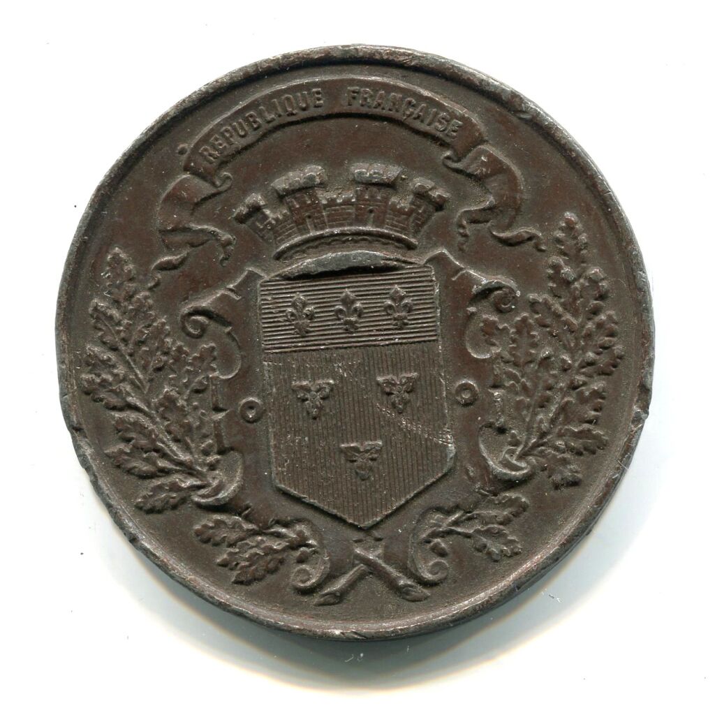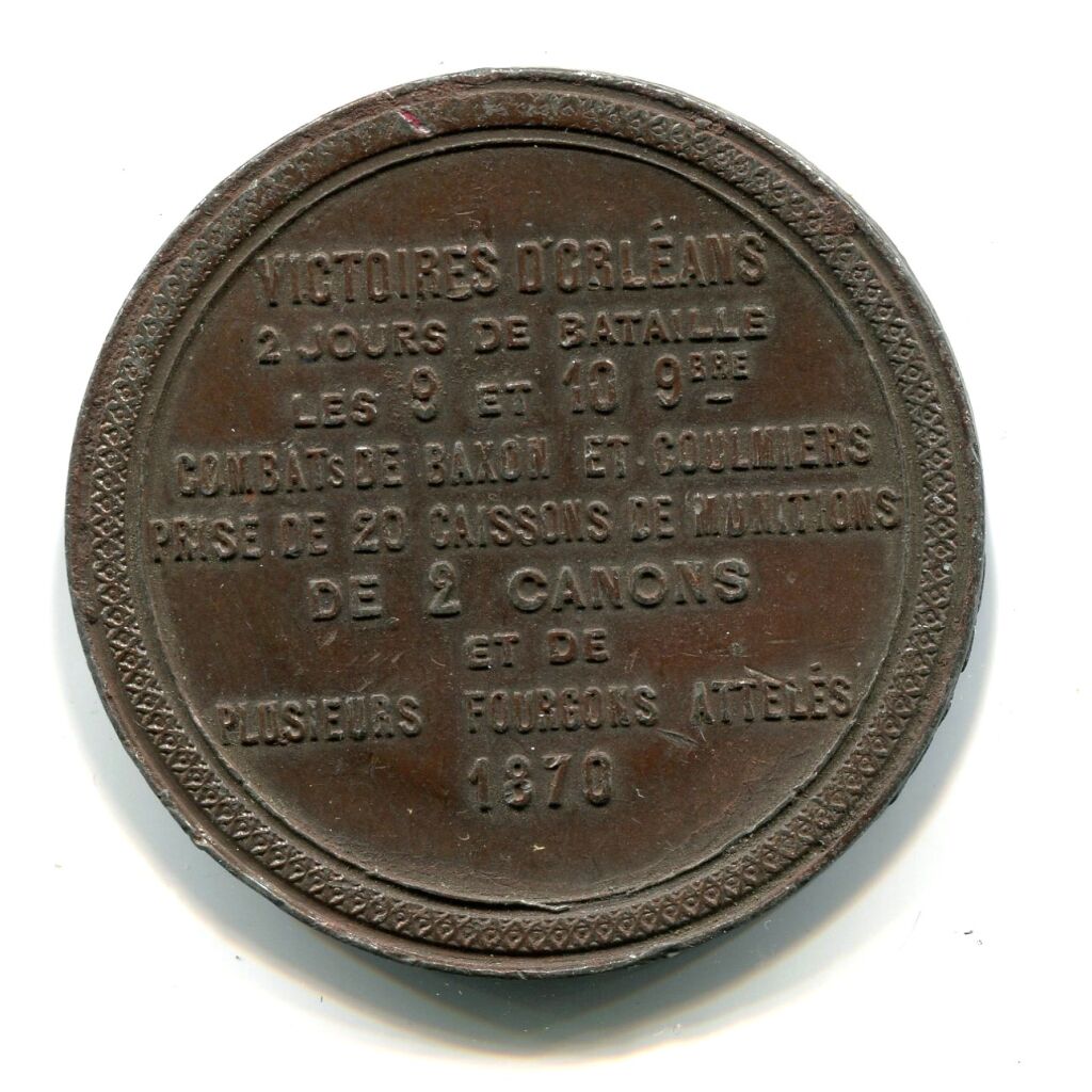 GUERRE 1870 - COMBATS D'ORLEANS - Médaille commémorative "République Française". Blason d'Orléans couronné posé sur un écu baroque accosté de 2 palmes de feuilles de chêne - au revers texte 9 lignes : " VICTOIRES D'ORLEANS 2 JOURS de BATAILLE les 9 et 10 9bre (novembre). COMBATS de BAXON et COULMIERS; PRISE de 20 CAISSES de MUNITIONS de 2 CANONS et DE PLUSIEURS FOURGONS ATTELES 1870 ". - Frise décorative en pourtour - Étain patiné chocolat - 45,5 mm - 48,07 grammes.