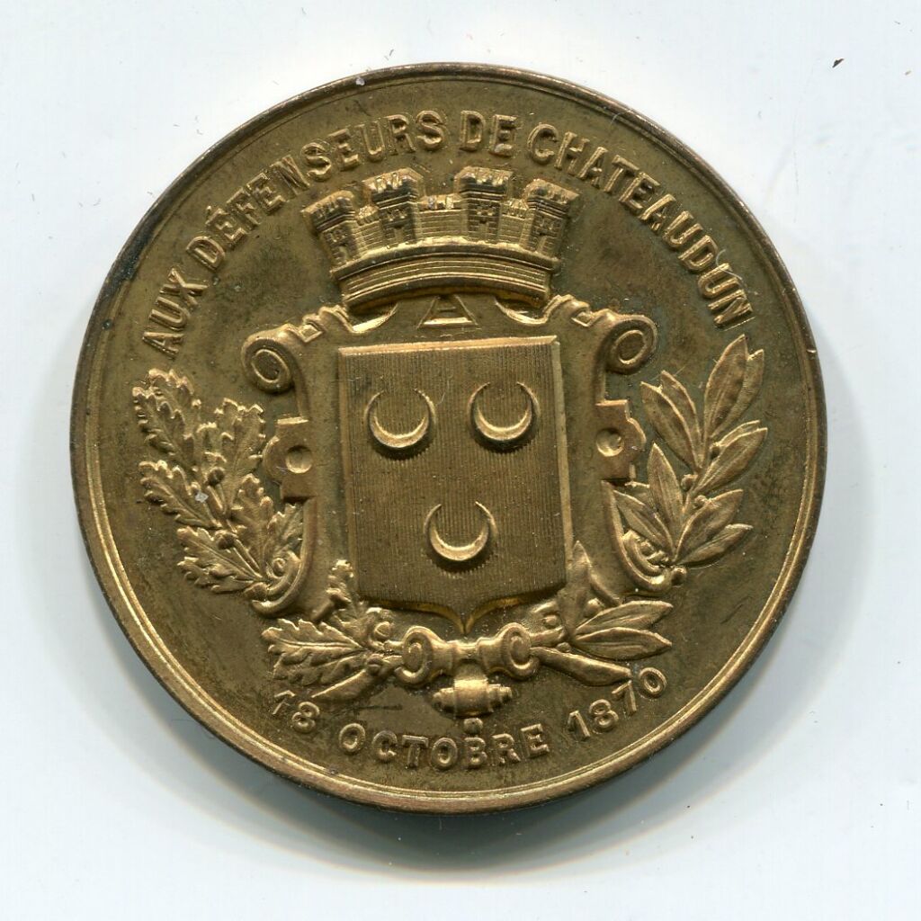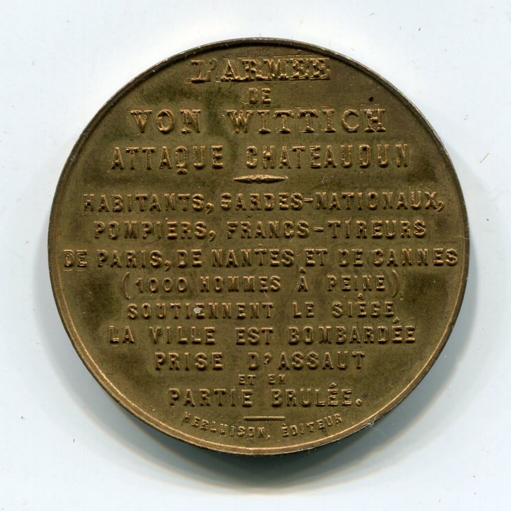 GUERRE - " AUX DEFENSEURS de CHATEAUDUN " (Eure et Loir ) 18 OCTOBRE 1870 " : Blason de ville couronné de 4 tours sur un écu baroque entouré de palmes de feuilles de chêne et de laurier - Texte 13 lignes au revers : " L'ARMEE de VON WITTICH ATTAQUE CHATEAUDUN - Habitants, gardes nationaux, pompiers, francs-tireurs de Paris, de Nantes et de Cannes (1000 hommes à peine) soutiennent le siège. La ville est bombardée, prise d'assaut et en partie brulée ". Médaille signée Herluison éditeur.
