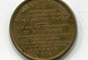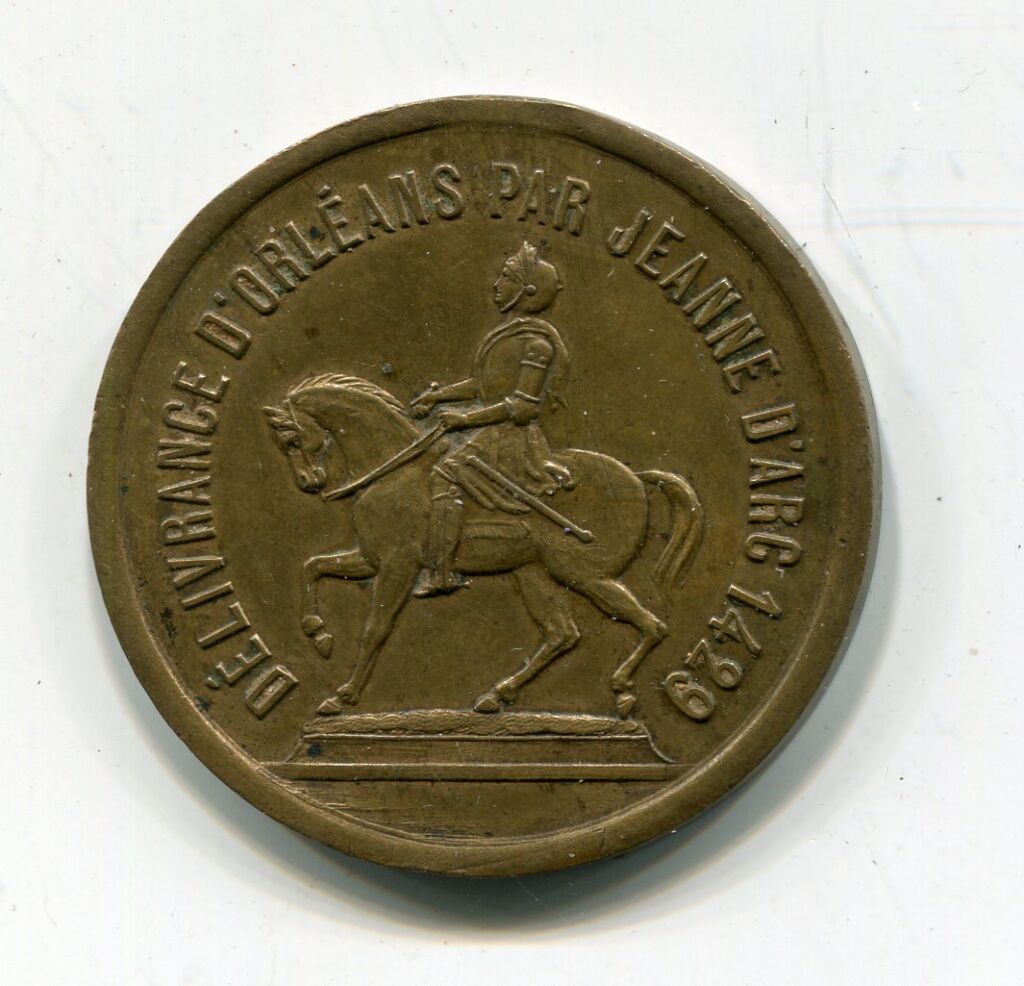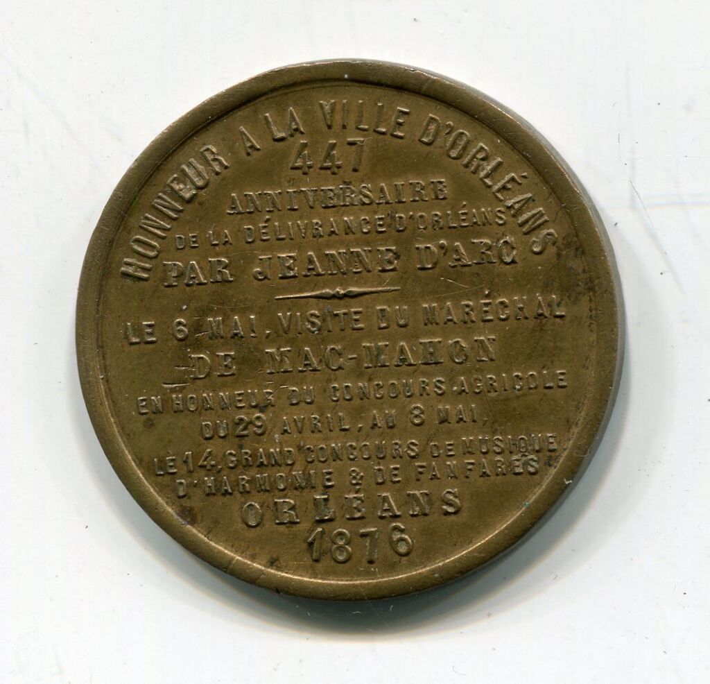 " HONNEUR à la VILLE D'ORLEANS - 447e anniversaire de la délivrance d'Orléans par JEANNE D'ARC / Le 6 mai VISITE du Maréchal de MAC MAHON, en l'honneur du CONCOURS AGRICOLE du 29 avril au 8 mai / le 14 grand concours de Musique, d'harmonie & de fanfares / ORLEANS 1876 " - Texte au revers, au droit : DELIVRANCE D'ORLEANS PAR JEANNE D'ARC 1429, statue équestre sur son socle, à gauche.