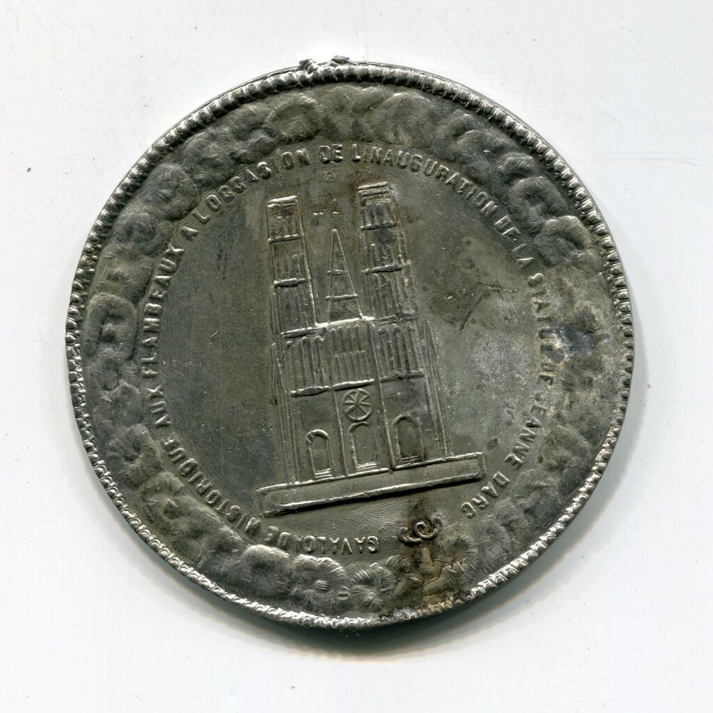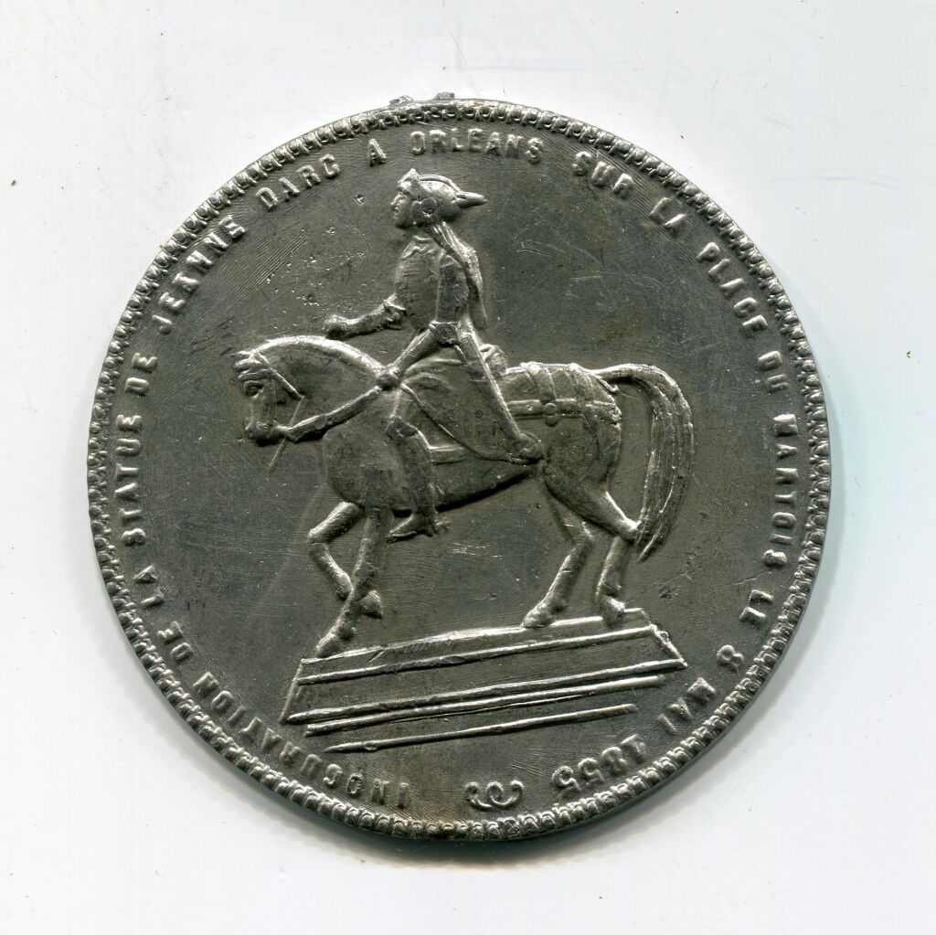 INAUGURATION de la STATUE de JEANNE D'ARC à ORLEANS sur la PLACE du MARTROI le 8 MAI 1855, en centre statue équestre de Jeanne d'Arc, bras droit avancé sans épée, sur un socle - Revers : couronne de nuages en flocons avec texte " Cavalcade historique aux flambeaux à l'occasion de l'inauguration de la statue de Jeanne d'Arc " ; en centre la cathédrale vue de face, une rosace sur le portail central. - avec bélière - TTB
