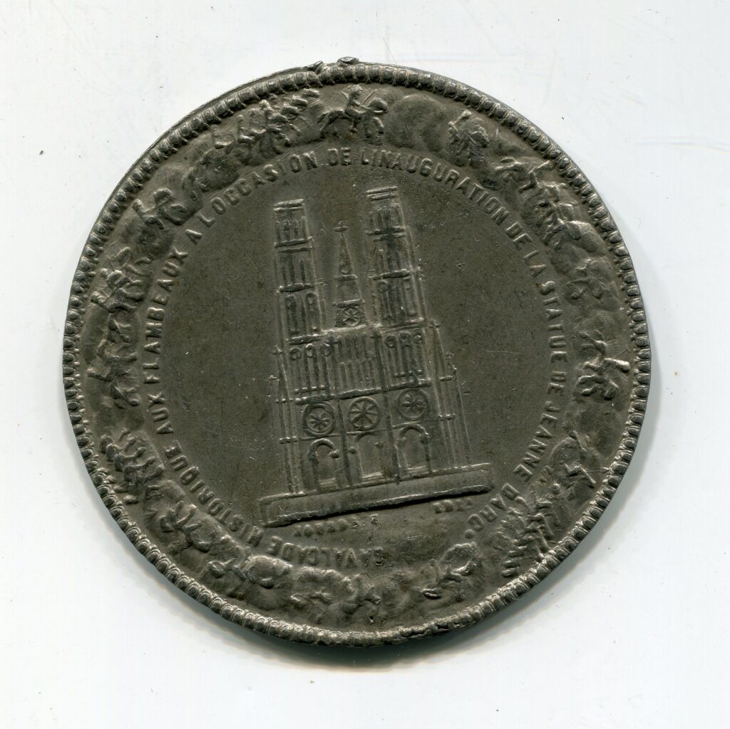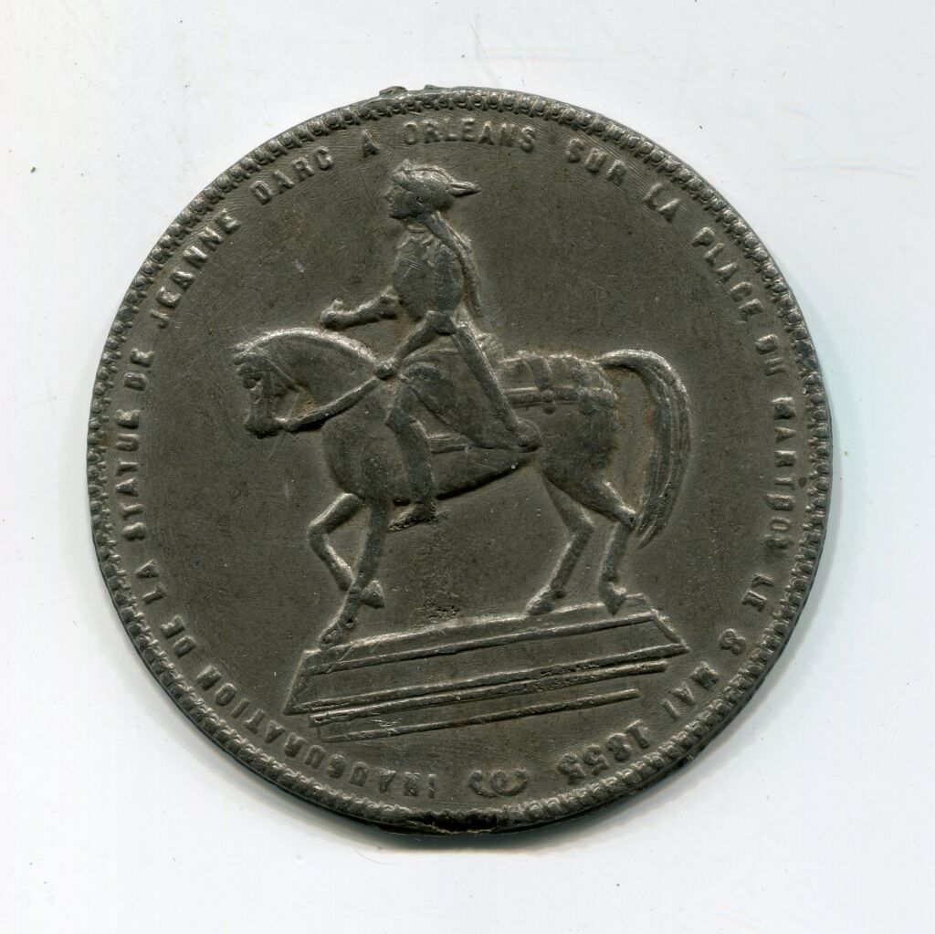 INAUGURATION de la STATUE de JEANNE D'ARC à ORLEANS sur la PLACE du MARTROI le 8 MAI 1855, en centre statue équestre de Jeanne d'Arc, bras droit avancé sans épée, sur un socle - Revers : couronne de nuages en flocons avec texte " Cavalcade historique aux flambeaux à l'occasion de l'inauguration de la statue de Jeanne d'Arc " ; en centre la cathédrale vue de face, une rosace sur tous les portails (3 rosaces au lieu d'une donc) AVEC signature graveur. - Étain 63 mm - 54,42 grammes - non référencé L/A.