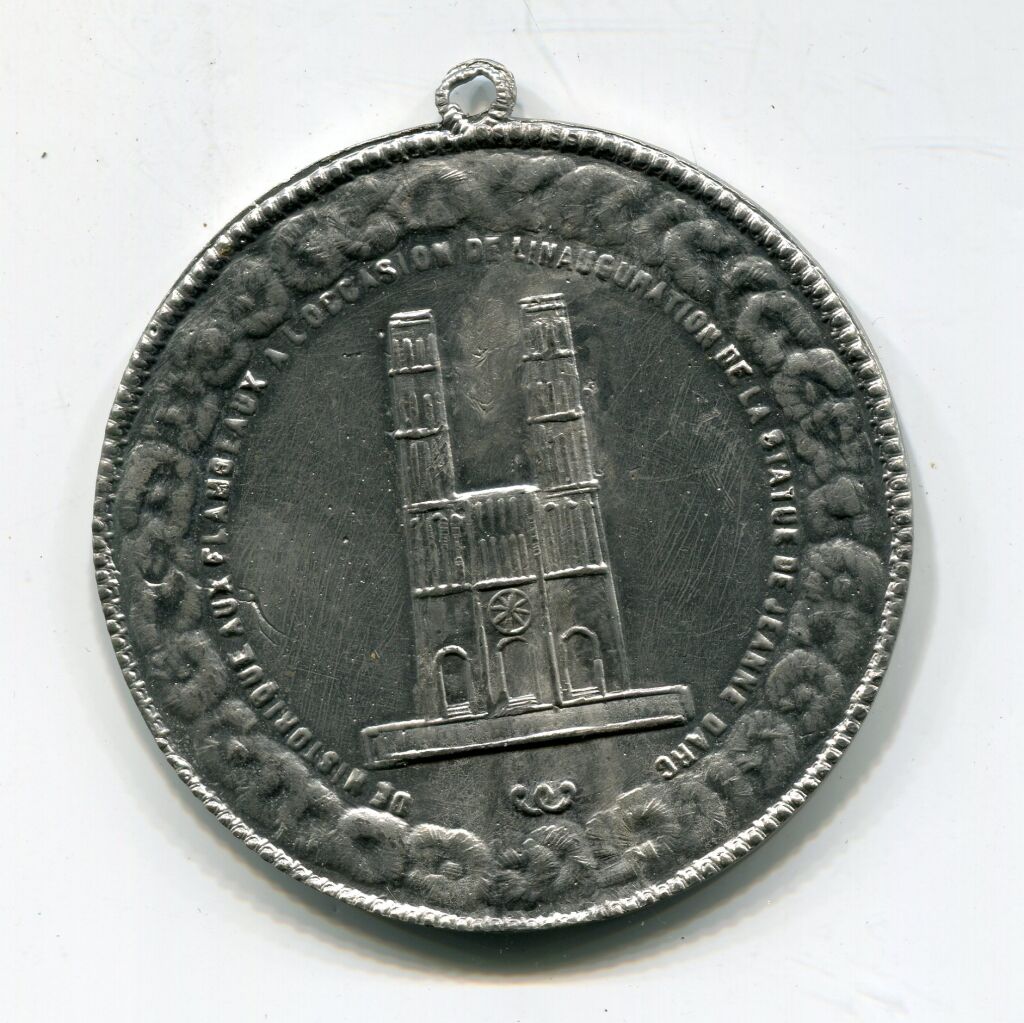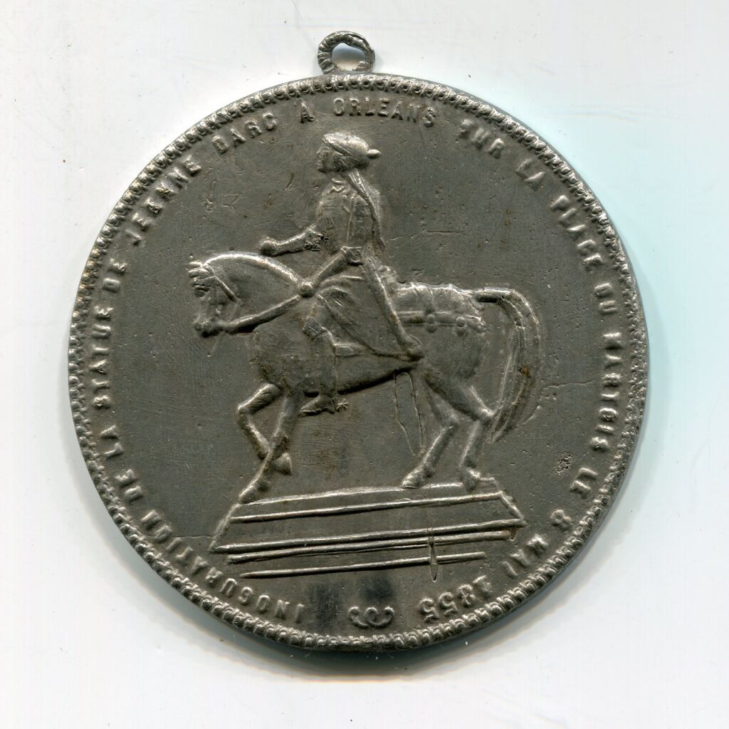 INAUGURATION de la STATUE de JEANNE D'ARC à ORLEANS sur la PLACE du MARTROI le 8 MAI 1855, en centre statue équestre de Jeanne d'Arc, bras droit avancé sans épée, sur un socle - Revers : couronne de nuages en flocons avec texte " Cavalcade historique aux flambeaux à l'occasion de l'inauguration de la statue de Jeanne d'Arc " ; en centre la cathédrale vue de face SANS SA FLECHE ENTRE LES 2 TOURS, une rosace sur le portail central. - avec bélière - une seule rosace; TTB