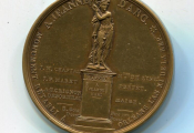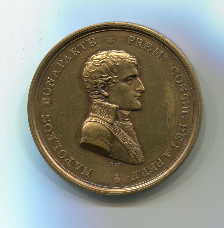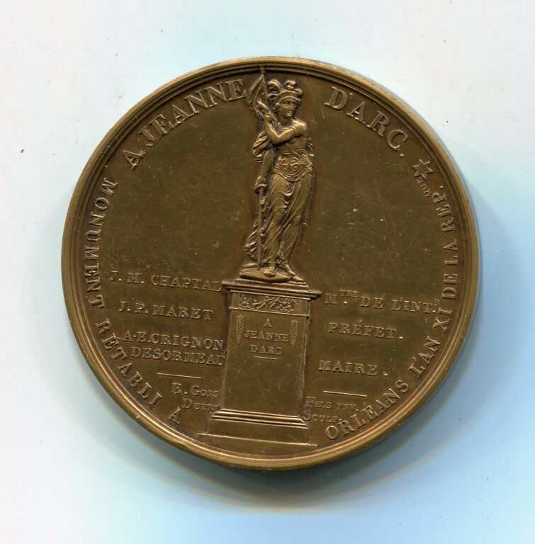 NAPOLEON BONAPARTE PREMIER CONSUL de la REPUBLIQUE ", son buste haut relief, tête nue, profil à droite ; œuvre signée DUPRE. - REVERS : en centre statue de Jeanne d'Arc debout sur socle, illustré d'un bas-relief guerrier, marquage "à Jeanne d'Arc" ; de part et d'autre du socle : " J.M. Chaptal Mtre de l'intérieur, J.P. Maret préfet, A.E. Grignon Desormeau Maire / E. Gois fils inv. / Dupré sculpteur. Médaille poinçons corne & bronze,