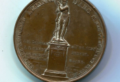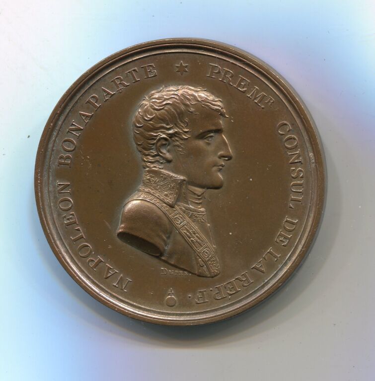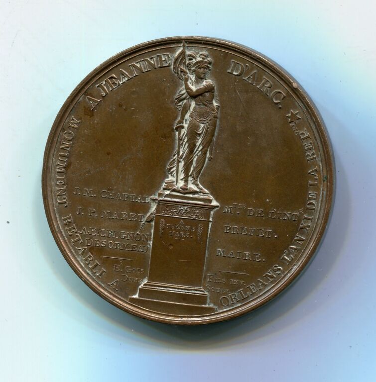 NAPOLEON BONAPARTE PREMIER CONSUL de la REPUBLIQUE ", son buste haut relief, tête nue, profil à droite ; œuvre signée DUPRE. - REVERS : en centre statue de Jeanne d'Arc debout sur socle, illustré d'un bas--relief guerrier, marquage "à Jeanne d'Arc" ; de part et d'autre du socle : " J.M. Chaptal Mtre de l'intérieur, J.P. Maret préfet, A.E. Grignon Desormeau Maire / E. Gois fils inv. / Dupré sculpteur. Médaille en cuivre sans poinçon, frappe d'époque - 54 mm - 84 grammes - L/A n° 1443 - TTB