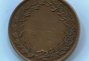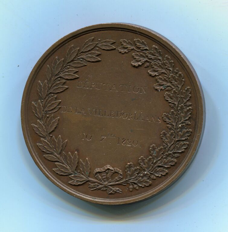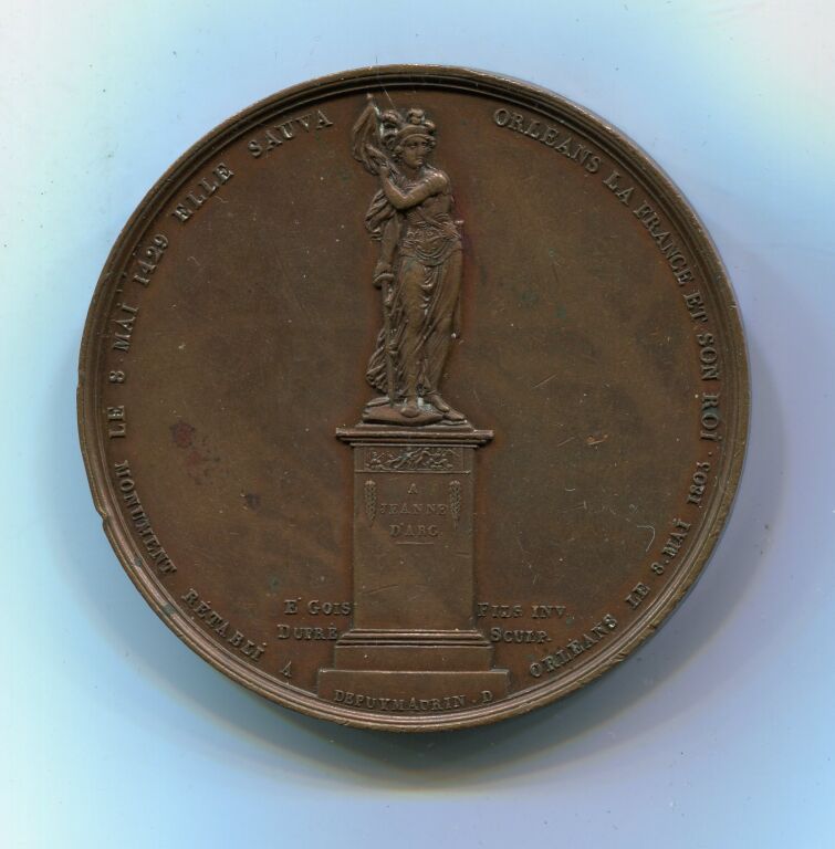 dans une couronne de feuilles d'olivier et feuilles de chêne " DEPUTATION de la VILLE D'ORLEANS 10 7bre 1820 " (septembre) ( * ) - Revers : statue de Jeanne d'Arc debout sur socle, illustré d'un bas relief guerrier, marquage "à Jeanne d'Arc" ; de part et d'autre du socle : " Le 8 mai 1429 elle sauva orléans et son roi ; Monument rétabli à orléans le 8 mai 1803 - E. GOIS FILS INV ( * ), Dupré sculpteur. En bas du piédestal signature Puymaurin. -