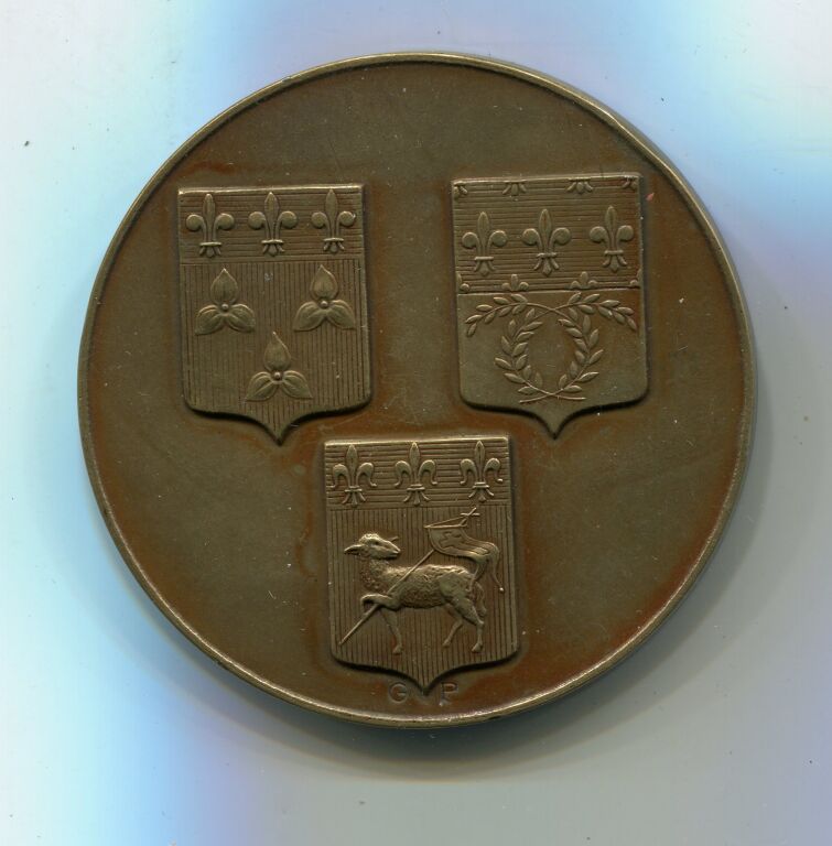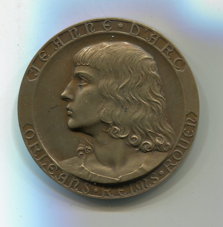 " JEANNE D'ARC ORLEANS - REIMS - ROUEN " - grande médaille bronze 59 mm, œuvre de PRUD' HOMME, ( * ) Beau profil de Jeanne tête nue, longs cheveux, profil à gauche - Revers : armoiries d'orléans avec palme, Reims et Rouen.