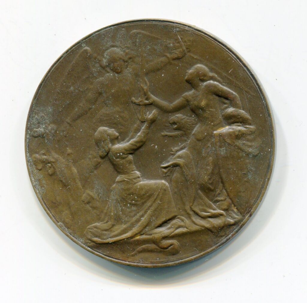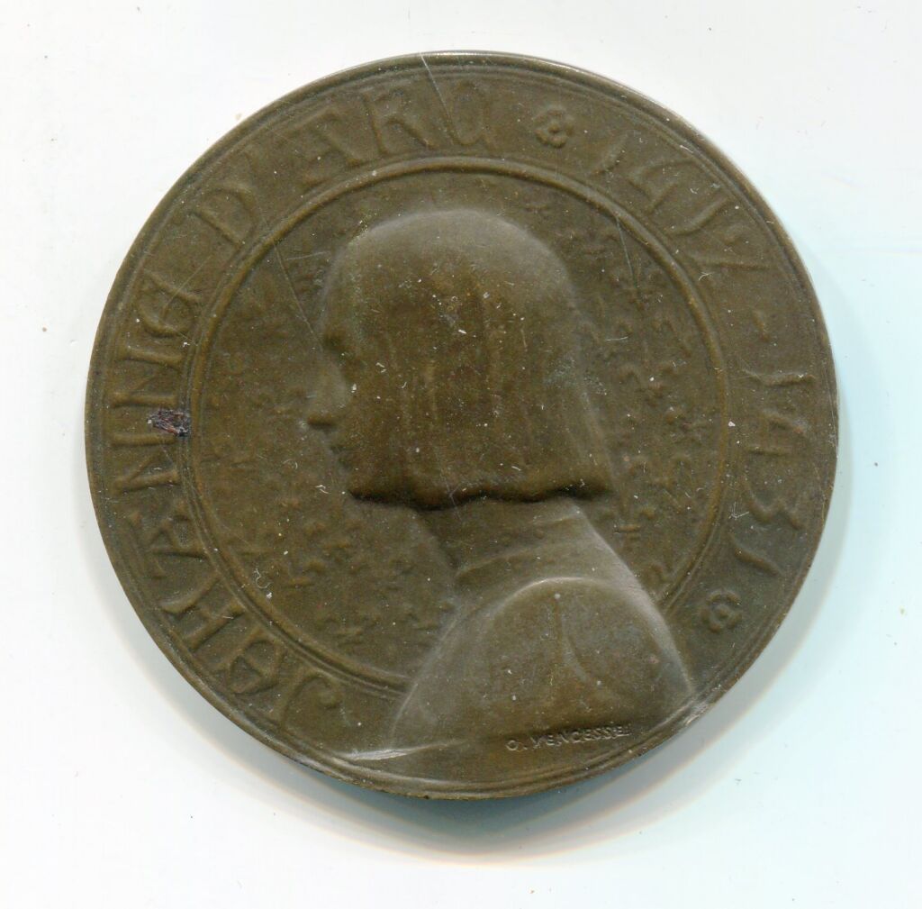 Revers : un ange ailé bras ouverts et la République, représentant la France, offrent une épée à Jeanne d'Arc à genoux - poinçon cuivre sur la tranche - 50 mm - 43,51 gr - TTB