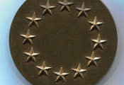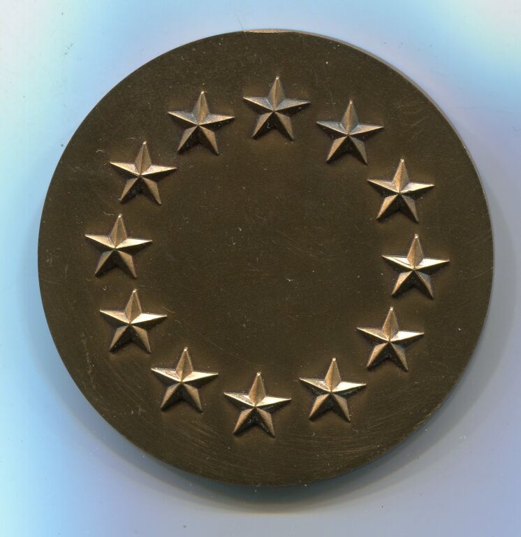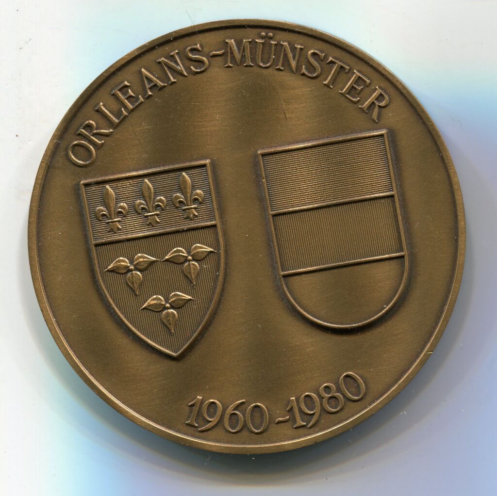 " JUMELAGE ORLEANS / MUNSTER 1960 - 1980 " - médaille de table commémorative BRONZE FLORENTIN, écus des deux villes - au revers cercle des douze étoiles de l'Europe, centre pour attribution. - 62,5 mm - 109 grammes - poinçon Arthus Bertrand.