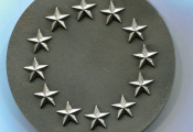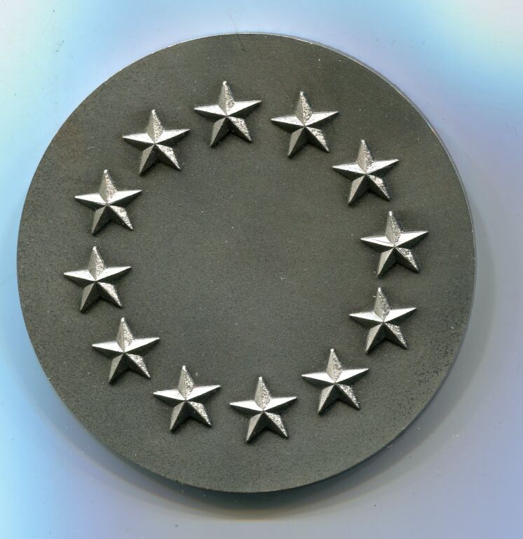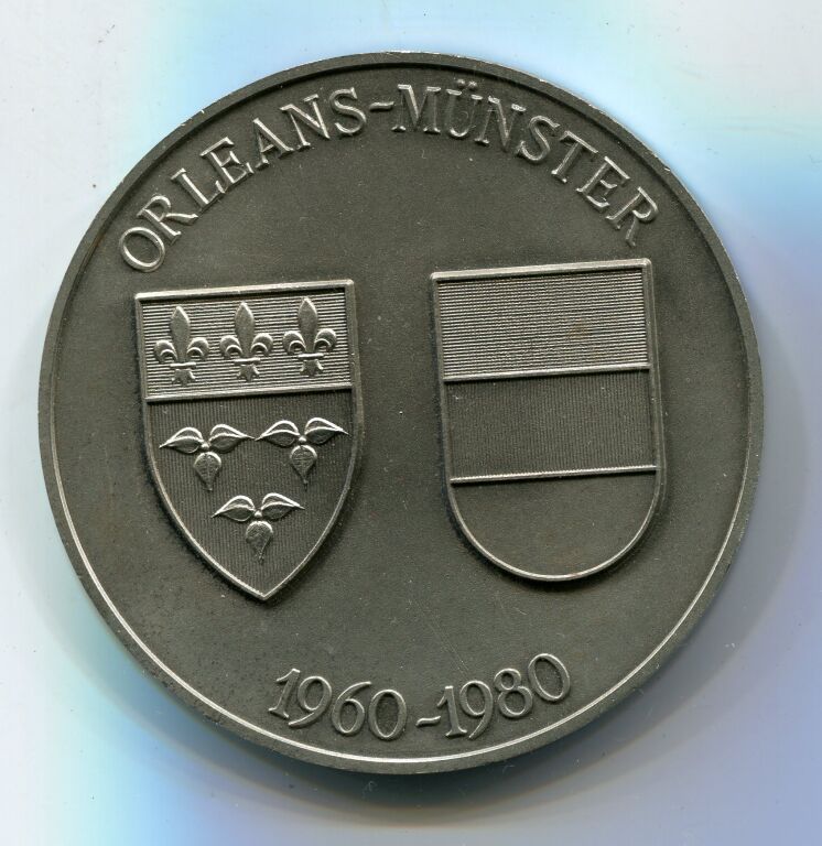 " JUMELAGE ORLEANS / MUNSTER 1960 - 1980 " - médaille de table commémorative classe argent en BRONZE ARGENTE, écus des deux villes - au revers cercle des douze étoiles de l'Europe, centre pour attribution. -