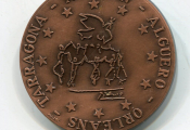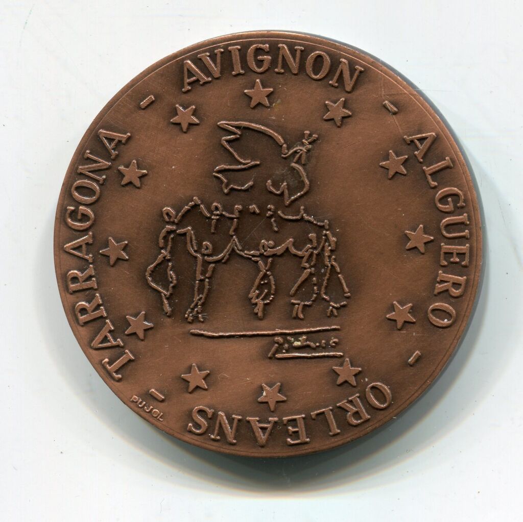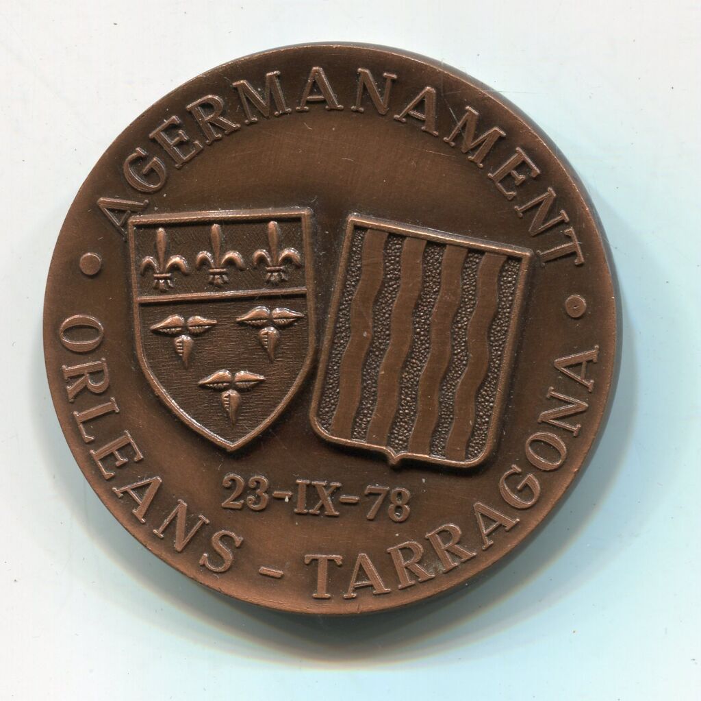 " JUMELAGE ORLEANS - TARRAGONE " - Médaille commémorative : " Germanament Orléans - Tarragona 23 - IX - 78 ", les blasons des 2 villes accolés - Revers : Colombe de la Paix au-dessus de la danse Sardane entourée de 12 étoiles ; en pourtour nom de villes jumelées " Avignon-Alguero / Orléans-Tarragona " - Frappe Pujol -