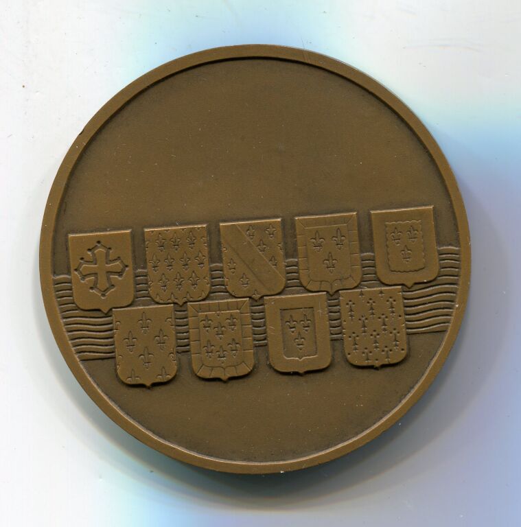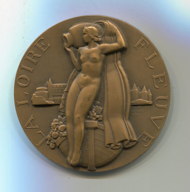 " LA LOIRE / FLEUVE " - Médaille bronze 1936 poinçon corne 58 mm, œuvre haut relief du sculpteur Marcel Renard :La Loire debout, vêtue d'une longue draperie, devant une barque chargée de fruits tient une jarre sur son épaule. En arrière-plan les châteaux d'Angers et d'Amboise. Revers : sur fond de fleuve stylisé 9 blasons des villes arrosées.