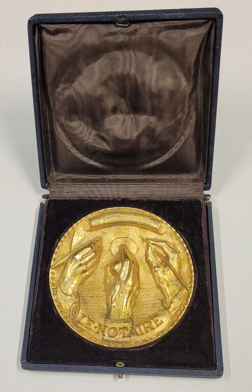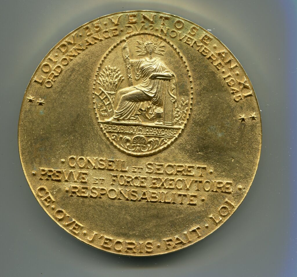 Revers : "Loi du 25 ventôse an XI, ordonnance du 2 novembre 1945. En centre reproduction de la plaque de fonction du notaire ; à l'exergue " Conseil et secret, Preuve et force exécutoire, ce que j'écris fait la Loi ". - en son coffret d'origine de présentation - SUP