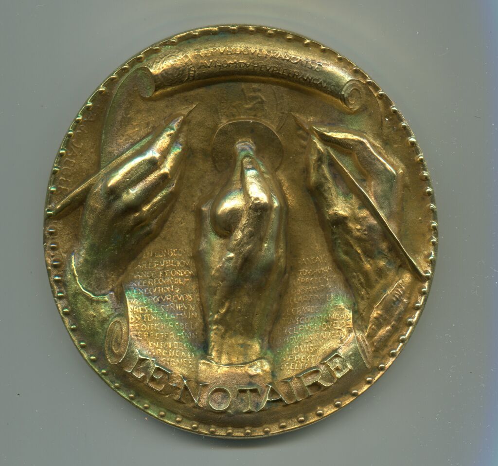 En très haut relief trois mains, 2 écrivant, une apposant le timbre à l'image de la république ; en haut : "République Française, au nom du peuple français", "le notaire" en bas.