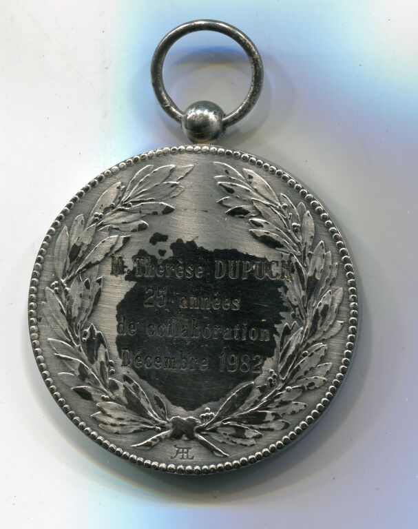 Blason d'orléans entre 2 palmes de feuilles de laurier - Attribution au revers , entre 2 palmes de laurier : " M Thérèse DUPUCH 25 ans de collaboration , Décembre 1982" Signature AEL à l'exergue. - sur la tranche poinçons bronze et corne, date de frappe 1967 -