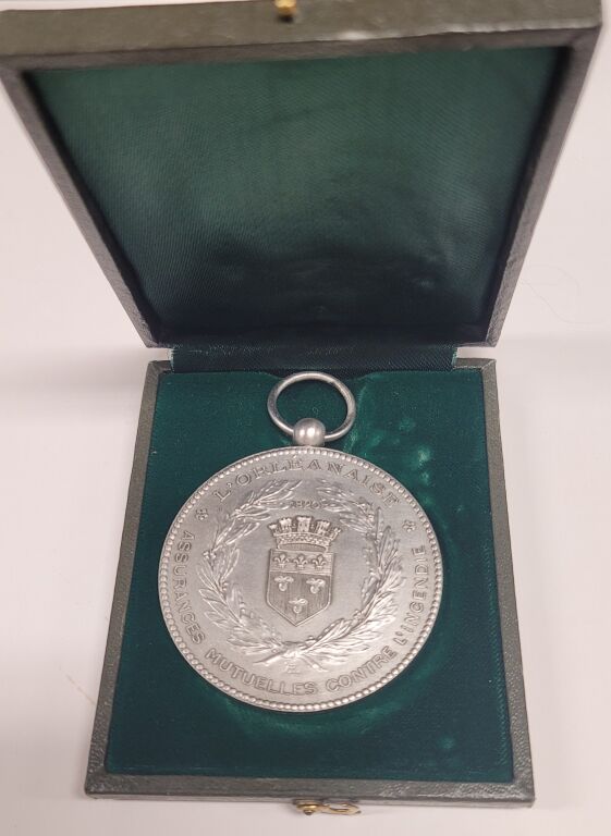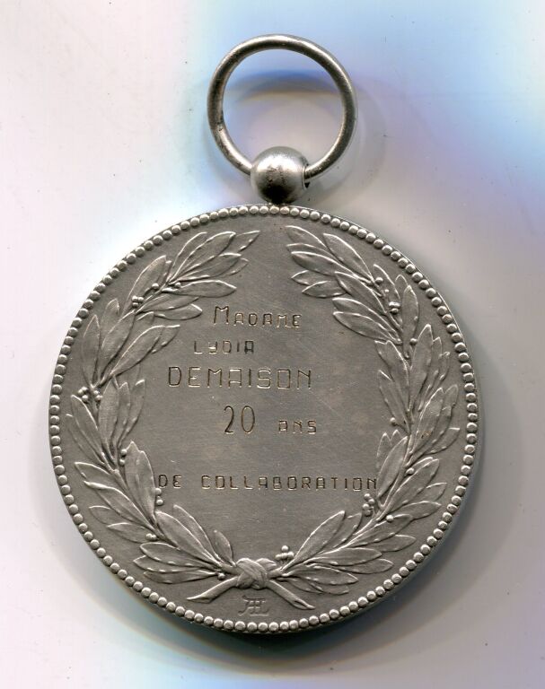 Blason d'orléans entre 2 palmes de feuilles de laurier - Attribution au revers , entre 2 palmes de laurier : " Madame Lydia DEMAISON 20 ans de collaboration " Signature AEL à l'exergue. - sur la tranche poinçons bronze et corne, date de frappe 1984 -