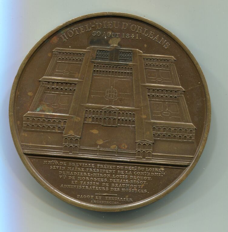 Revers : " HOTEL DIEU D'ORLEANS 30 AOUT 1841 ", plan en perspectives du futur hôpital. A l'exergue sur 8 lignes : " MMrs O. de Breville Préfet du Dept du Loiret, Sevin Maire / Président de la Com Administrative Demadiere-Tiron, Louis Dequoy / Vte de Morogues, Dehais-Bigot et Tassin de Beaumont administrateurs des Hospices / Pagot et Thuillier architectes " - 176 grammes - L/A n° 1436 - TTB