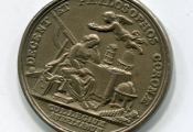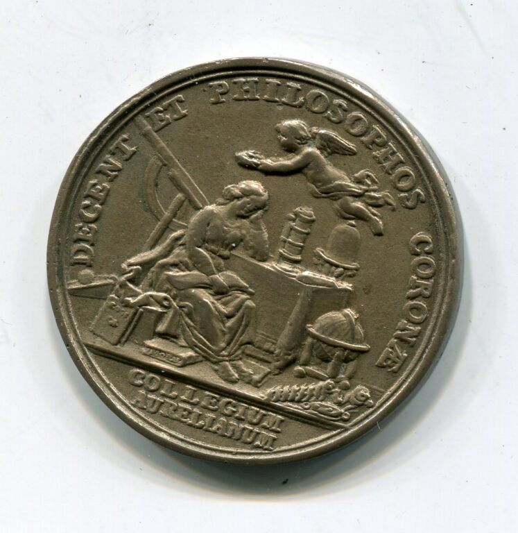 Revers : " DECENT ET PHILOSOPHOS CORONAE " (les couronnes conviennent également aux philosophes) : allégorie représentant l'étude, assise devant une table chargée d'instruments scientifiques ; au-dessous vole un amour tenant une couronne ; à sa droite une mappemonde ; à sa gauche lunette astronomique. - à l'exergue : " COLLEGIUM AURELIANUM " - En étain bronzé, sans doute frappe tardive du 19e siècle.