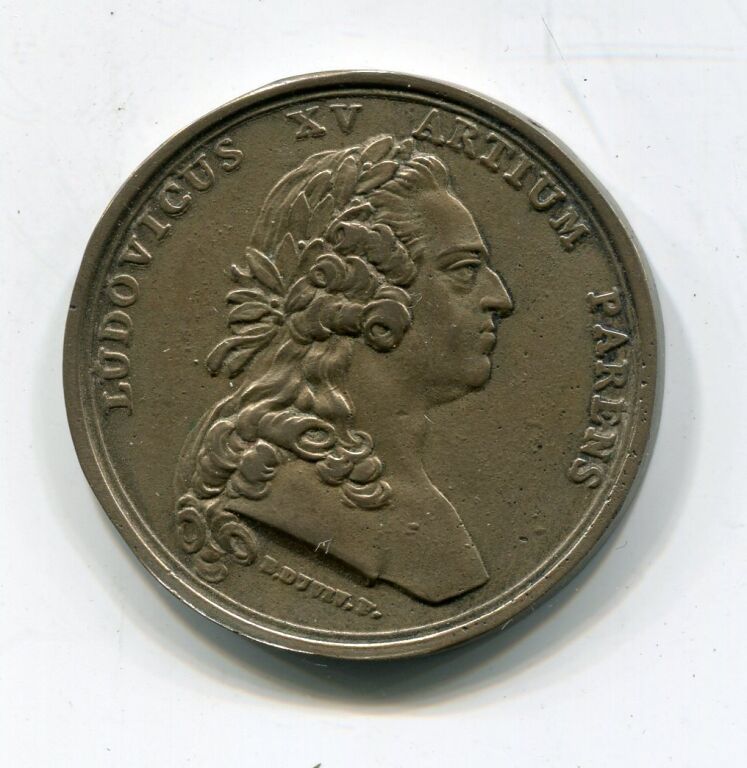 " LUDOVICUS XV ARTIUM PARENS " (louis 15 père des arts), buste du roi, tête laurée, longs cheveux noués par un ruban, profil à droite - œuvre signée B. DUVIV.
