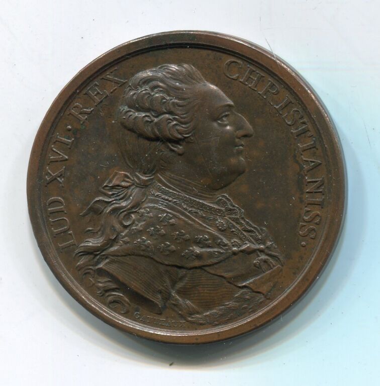 LUD . XVI . REX CHRISTIANISS, buste habillé avec manteau d'hermine fleurdelisé du Roi, aux cheveux noués d'un ruban, haut relief profil à droite.