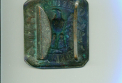 Laiton estampé patiné, aigle impérial ailes déployées posé sur 2 rameaux noués de feuilles d'olivier ; lettrage en pourtour dans une banderole. Rectangle 60 x 56 mm.