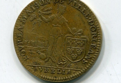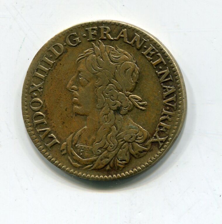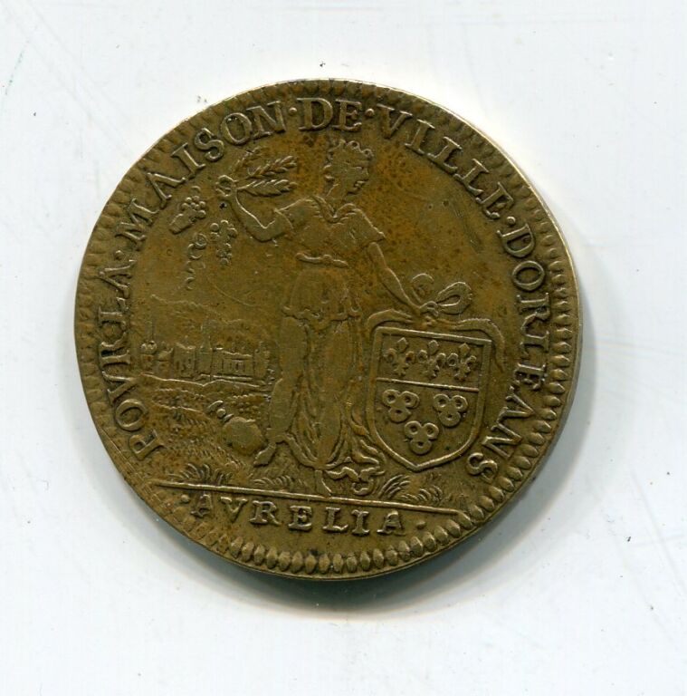 MAISON COMMUNE de la VILLE D'ORLEANS - cuivre non daté - " LVDOVICUS . XIII .D. G. FRANC. ET. NAV. REX, buste du roi, tête laurée, profil à gauche - Revers : POVR LA MAISON DE VILLE DORLEANS, en centre femme debout appuyée sur le blason de ville et brandissant une poignée d'épis et de raisins ; à ses pieds une urne renversée. Au loin vue sur la ville ; à l'exergue AVRELLIA - frappe monnaie -