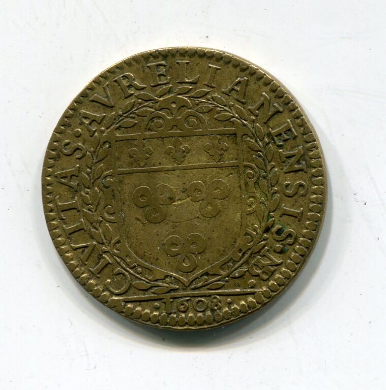 Revers : CIVITAS. AVRELLIANENSIS . NB, date 1608 à l'exergue. En centre écu aux armes d'Orléans entre deux palmes. Frappe monnaie.
