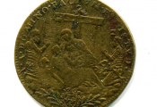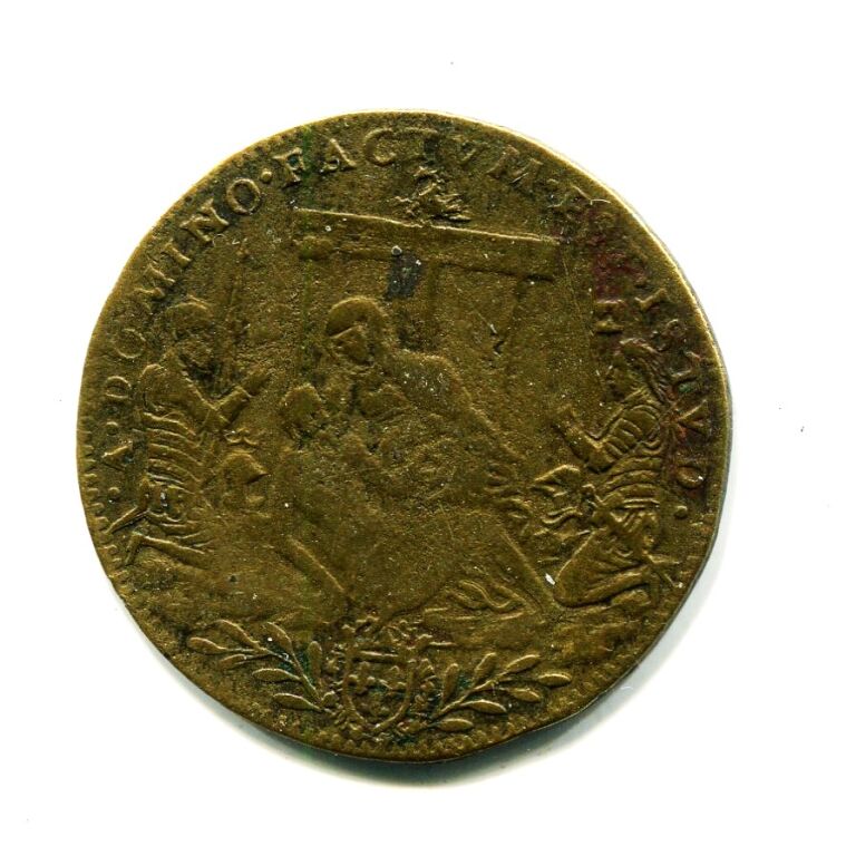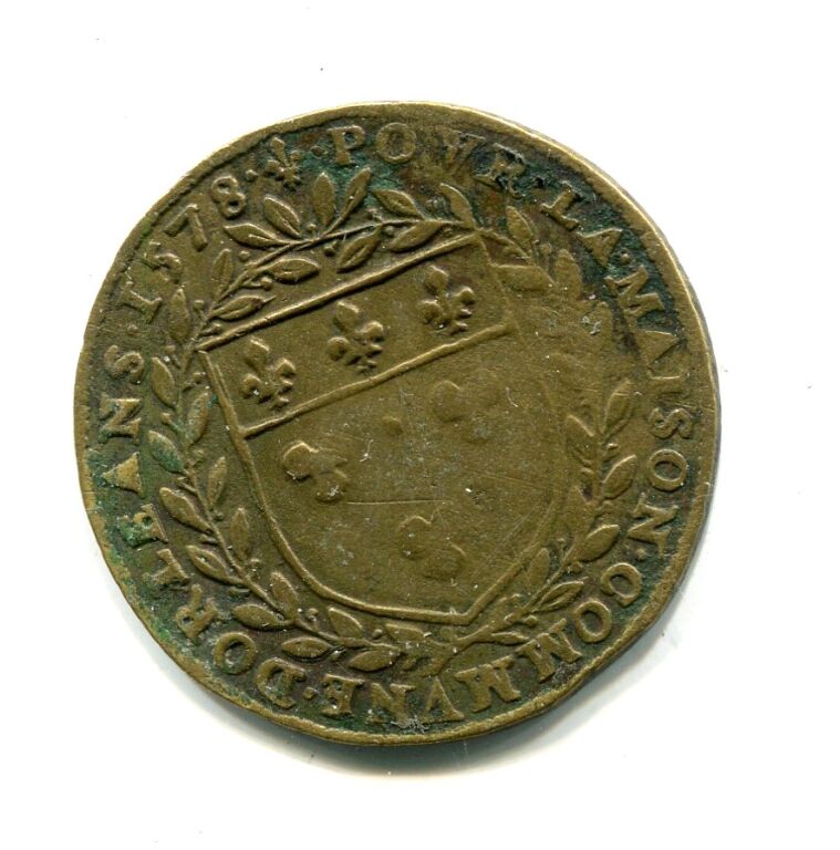 MAISON COMMUNE de la VILLE D'ORLEANS - Jeton laiton - " (fleur de lis) 1578 - POVR. LA. MAISON. COMMVNE. DORLEANS " - en centre armes d'Orléans entourées de deux palmes - Revers : A. DOMINO. FACTVM. EST. ISTVD., Piéta en centre sur fond de croix et entourée, à gauche, du roi cuirassé à genoux, son casque à ses pied, et à droite de Jeanne d'Arc cuirassée et à genoux, tenant la bannière de France. A l'exergue l'écu de France couronné. - frappe médaille décalée -