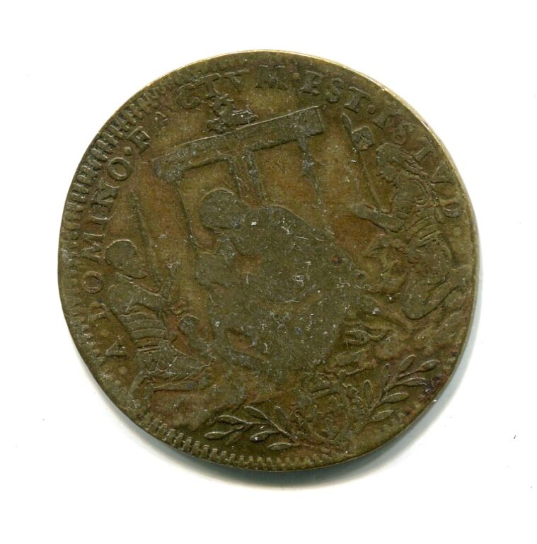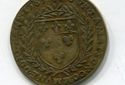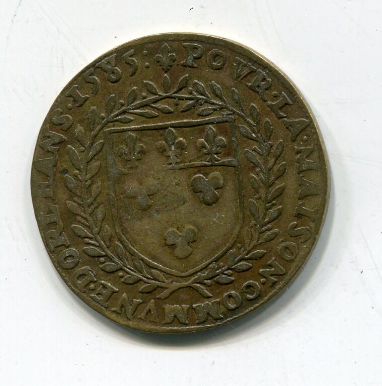 MAISON COMMUNE de la VILLE D'ORLEANS - Jeton laiton - " (fleur de lis) 1585 - POVR. LA. MAISON. COMMVNE. DORLEANS " - en centre armes d'Orléans entourées de deux palmes - Revers : A. DOMINO. FACTVM. EST. ISTVD., Piéta en centre sur fond de croix et entourée, à gauche, du roi cuirassé à genoux, son casque à ses pied, et à droite de Jeanne d'Arc cuirassée et à genoux, tenant la bannière de France. A l'exergue l'écu de France couronné. - frappe médaille -